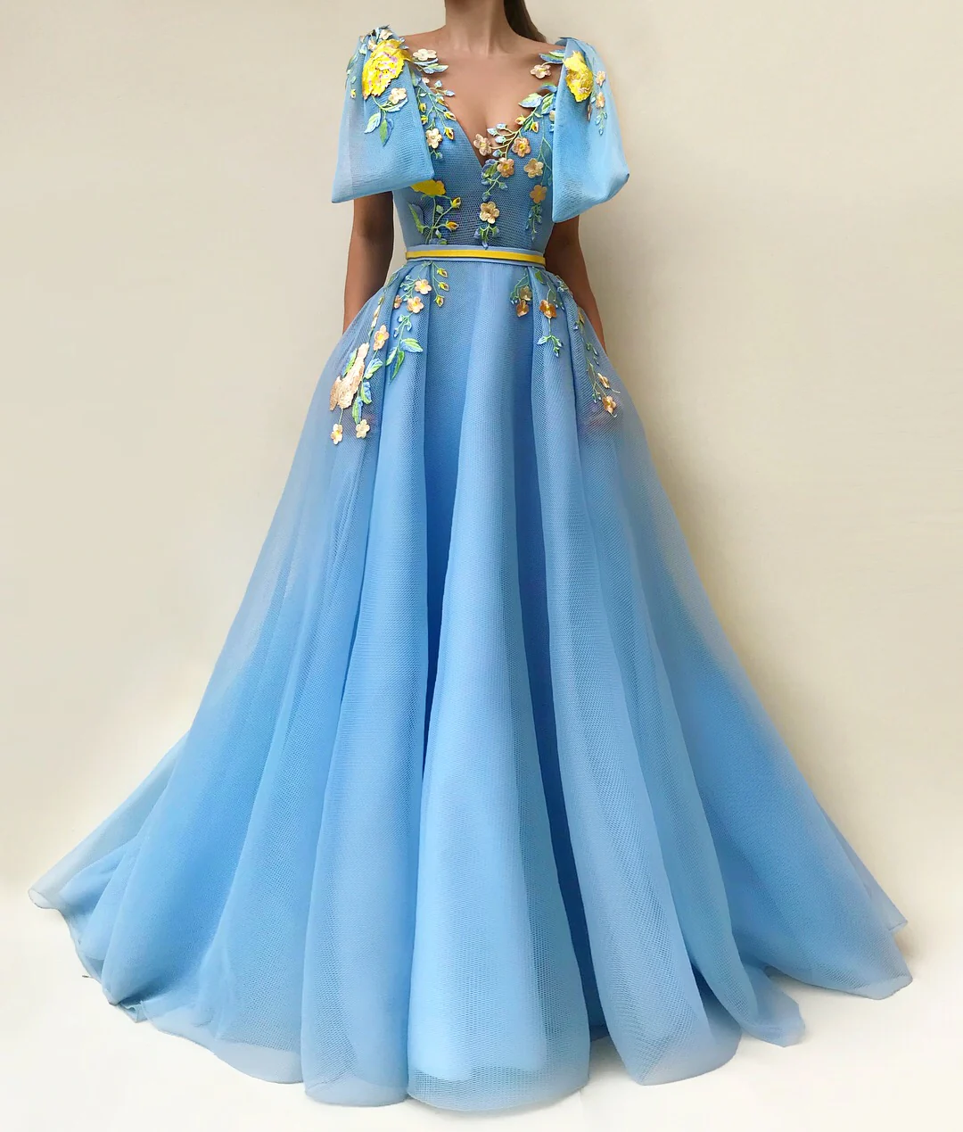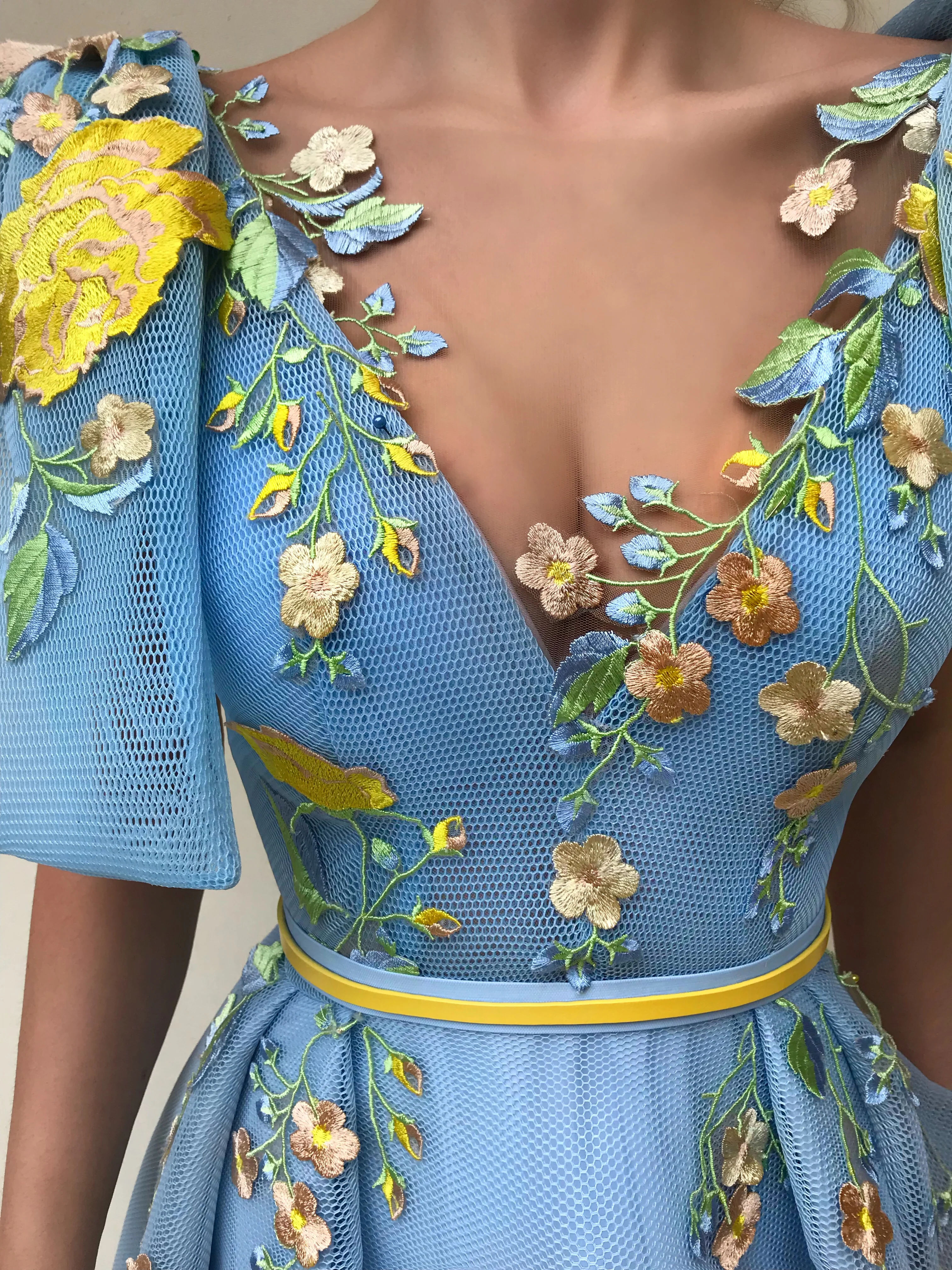 - Handmade embroidered yellow flowers and belt