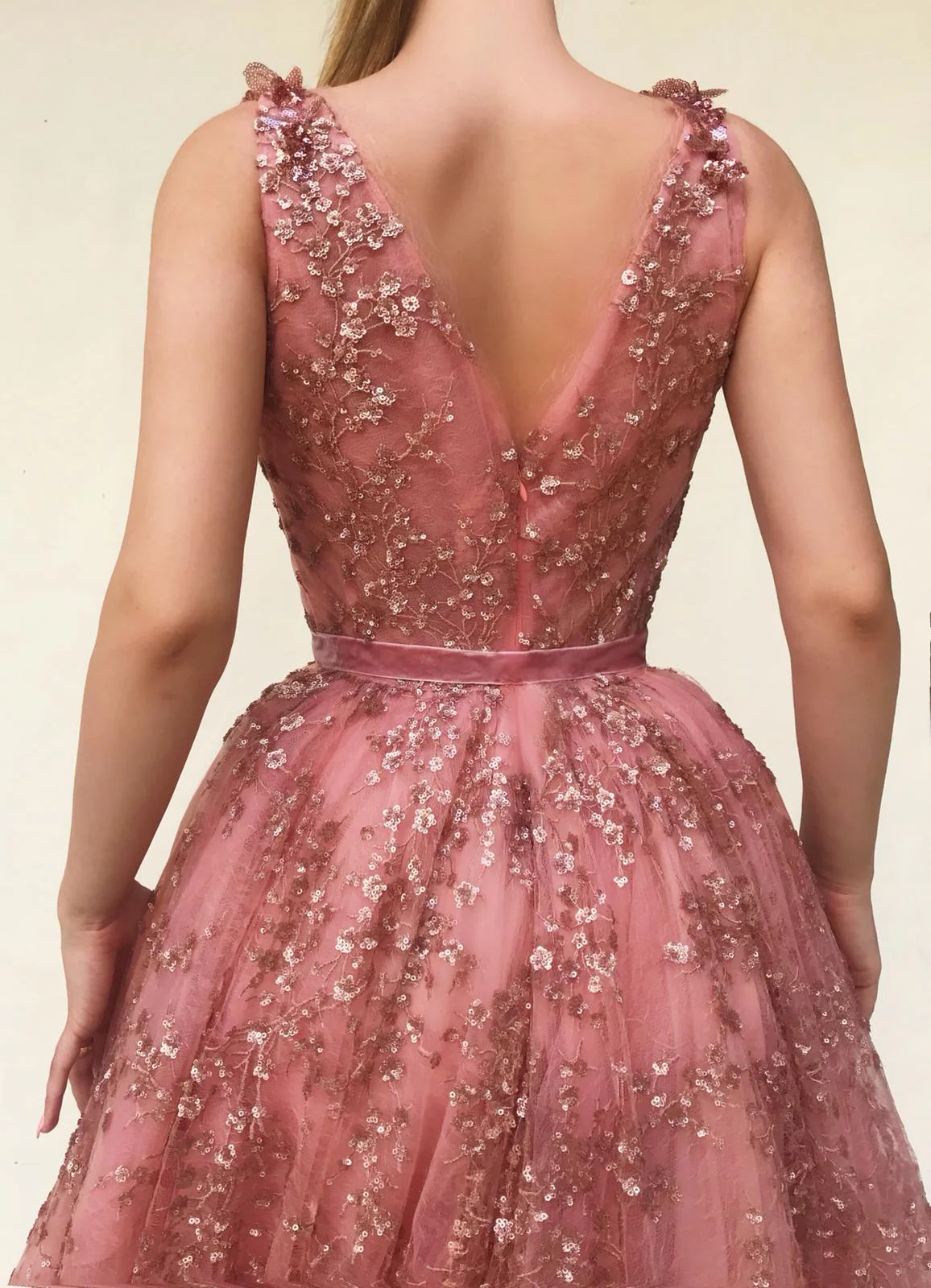 - Handmade embroidered flowers and pink velvet belt