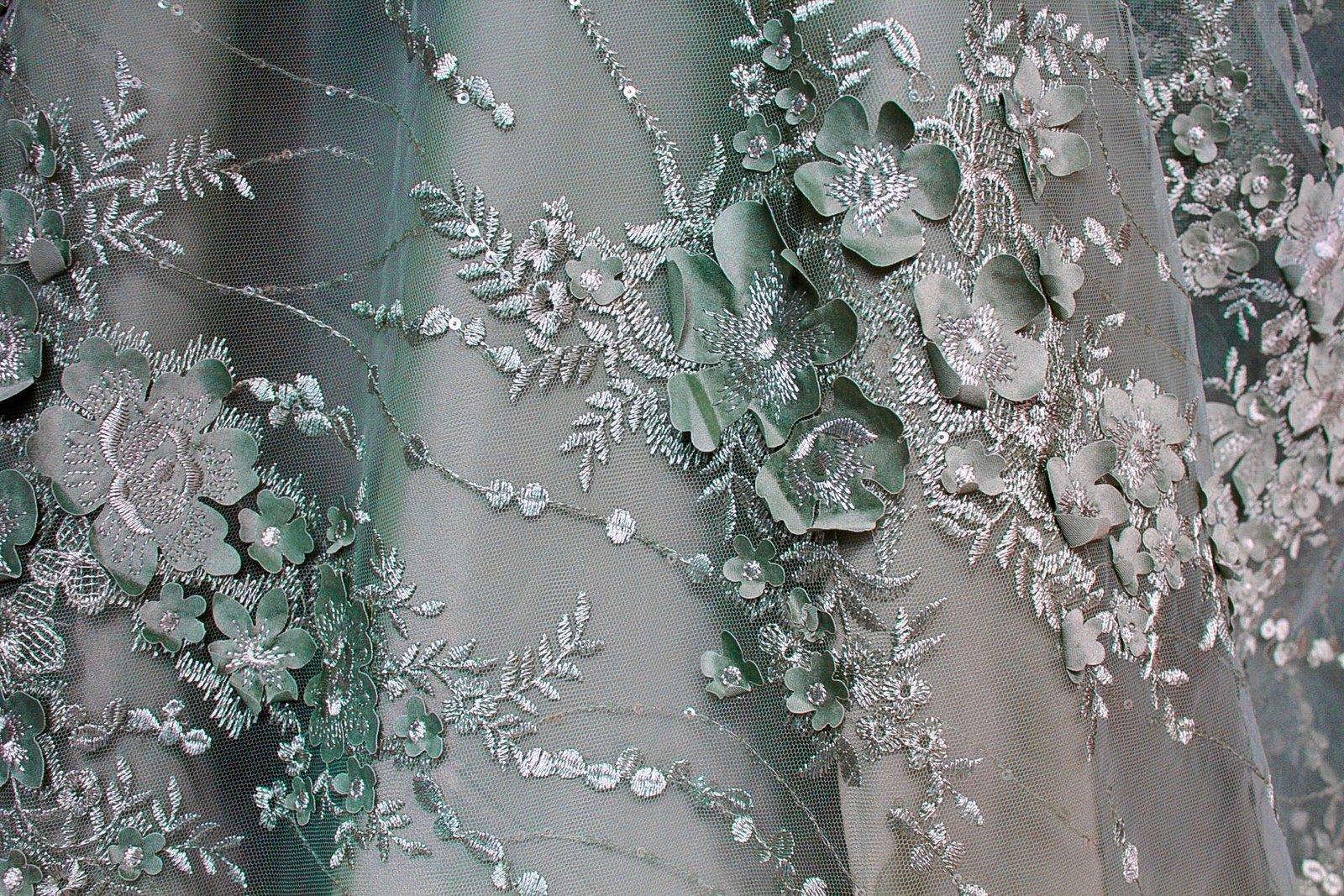 - Embroidered tulle fabric with chiffon flowers