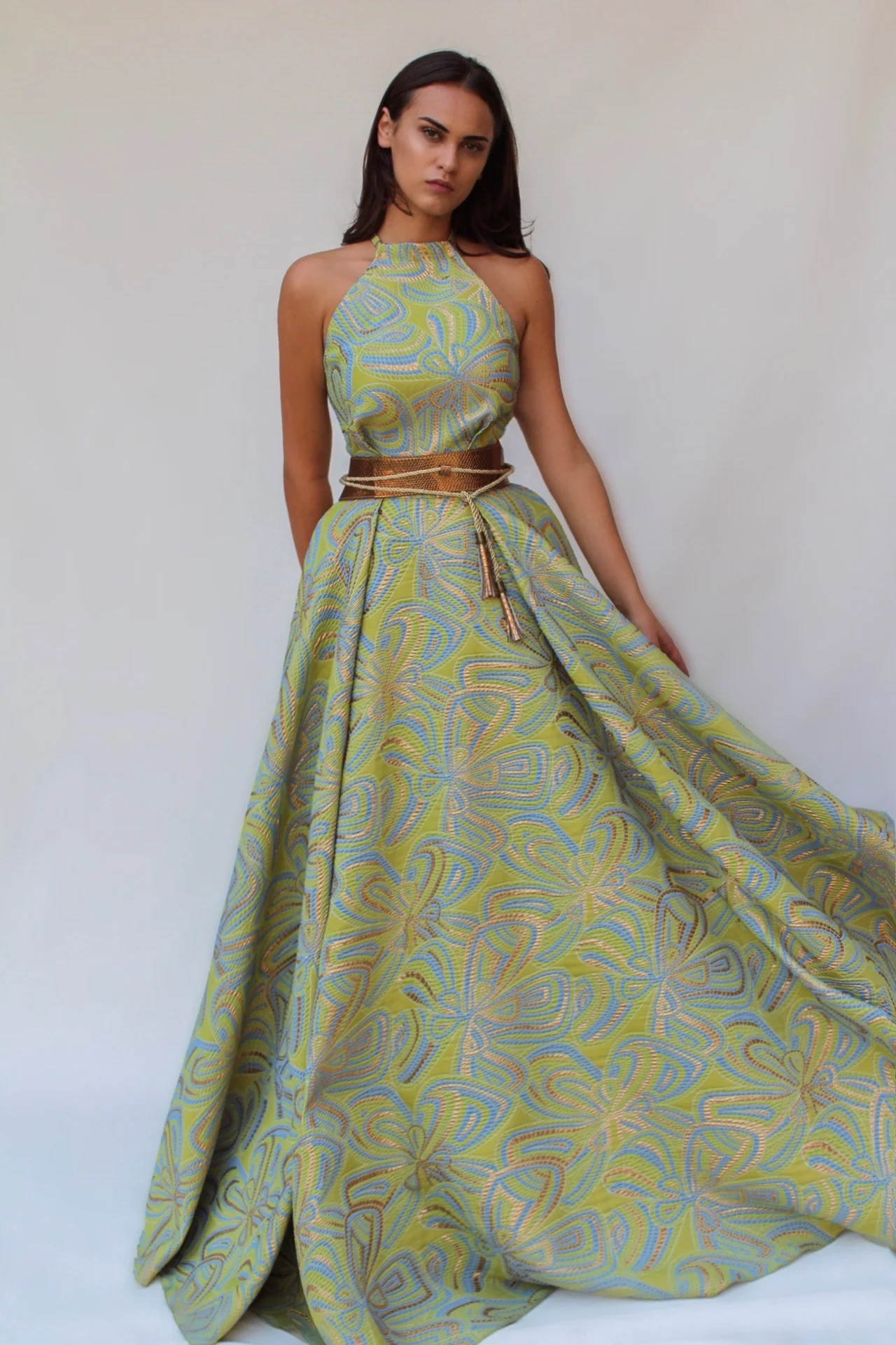 - A-line dress with waist definition and halter-neck
