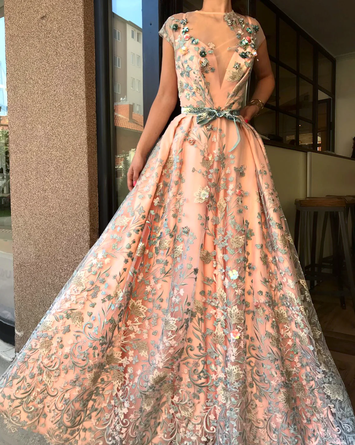 - Handmade embroidered unique flowers and shiny turquoise velvet belt