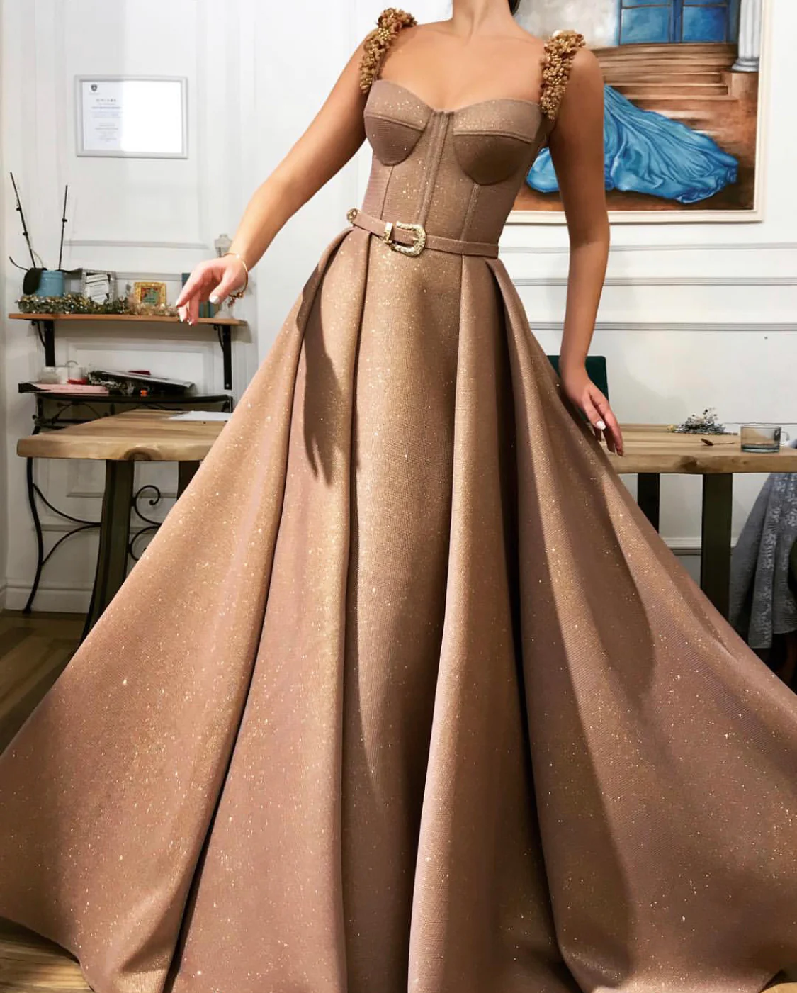 - Ball gown dress shape with waist definition