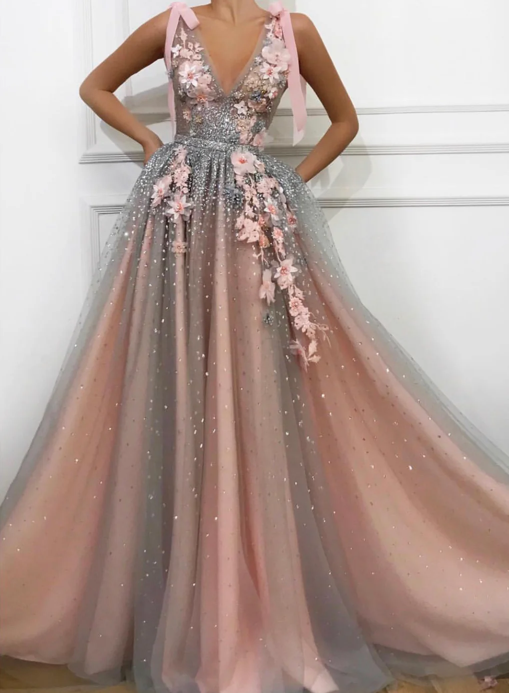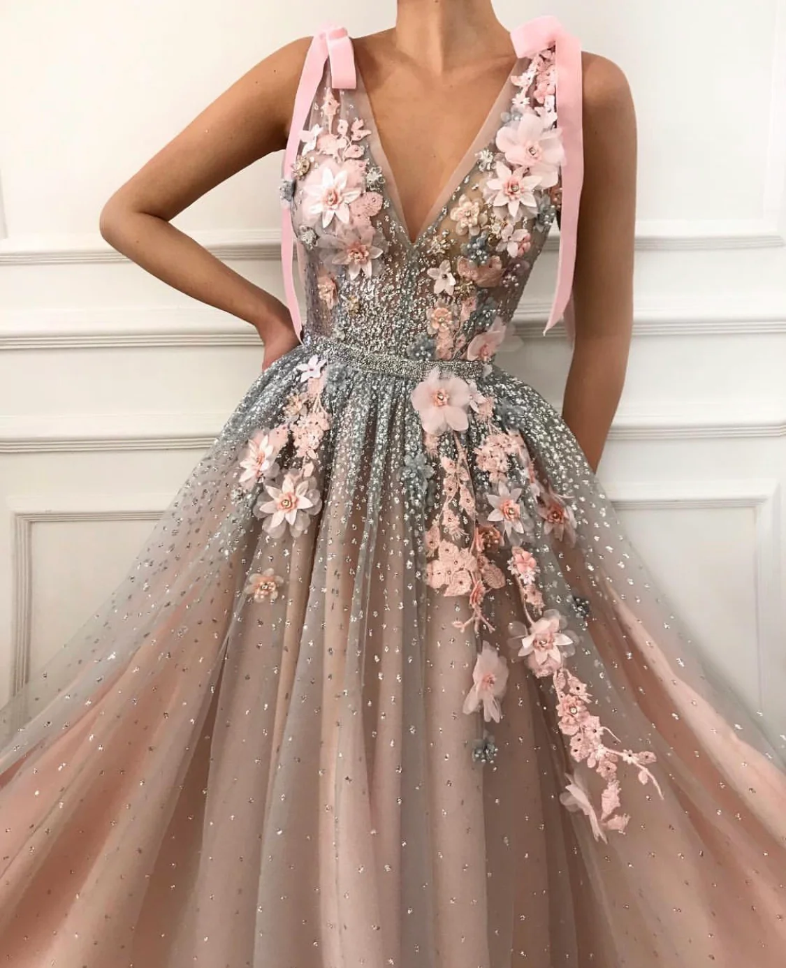 - Handmade embroidered flowers and shiny silver belt detail