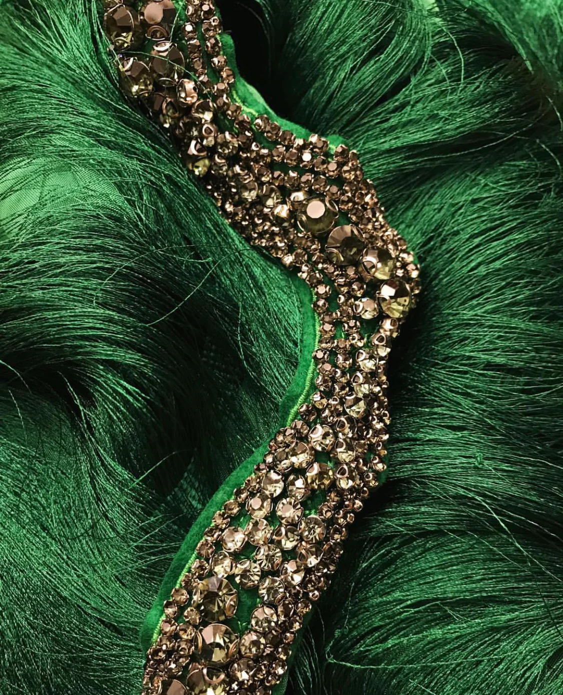 - Handmade embroidered crystal details on shoulder with a green velvet belt