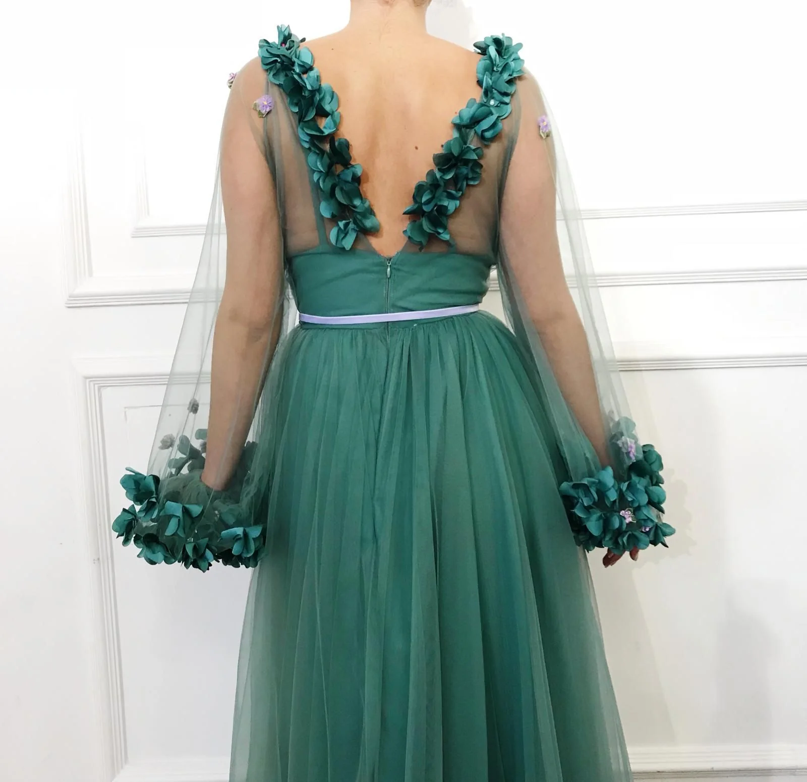 - Ball gown dress with open skirt, V-neck and long sleeves