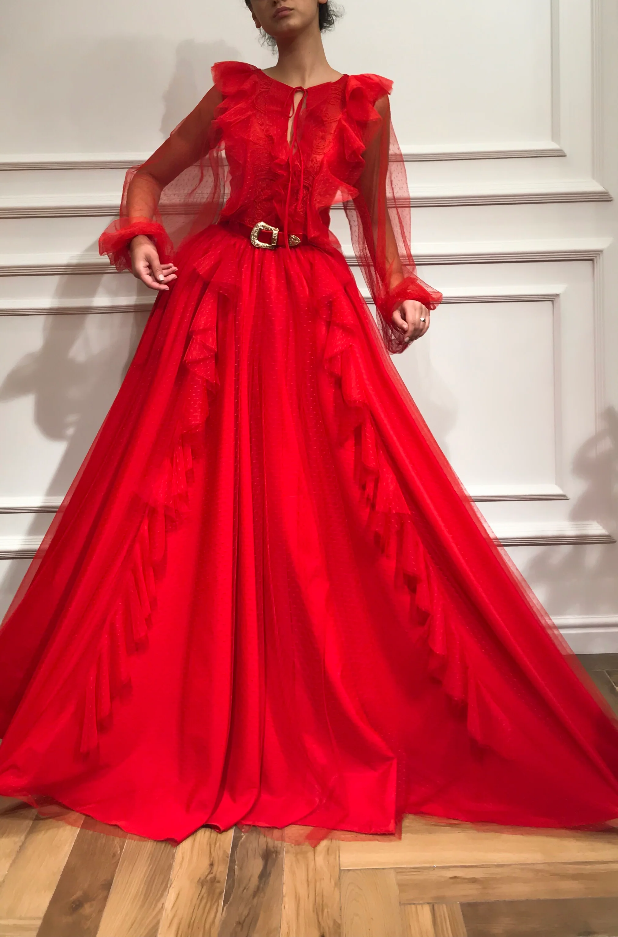 -Ball gown dress style with long sleeves and waist definition
