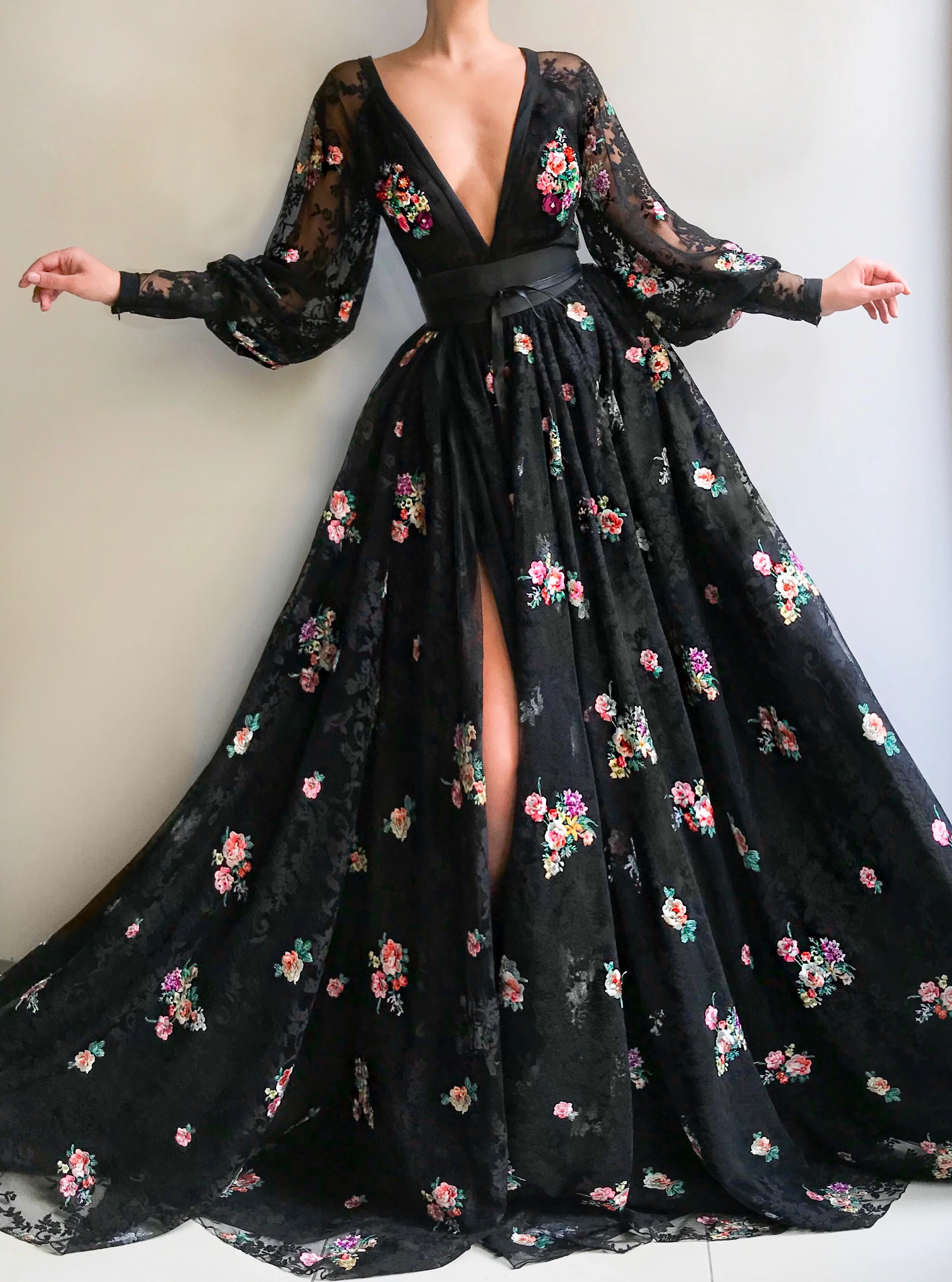 - A-line dress shape,long sleeves, V-neck and waist definition