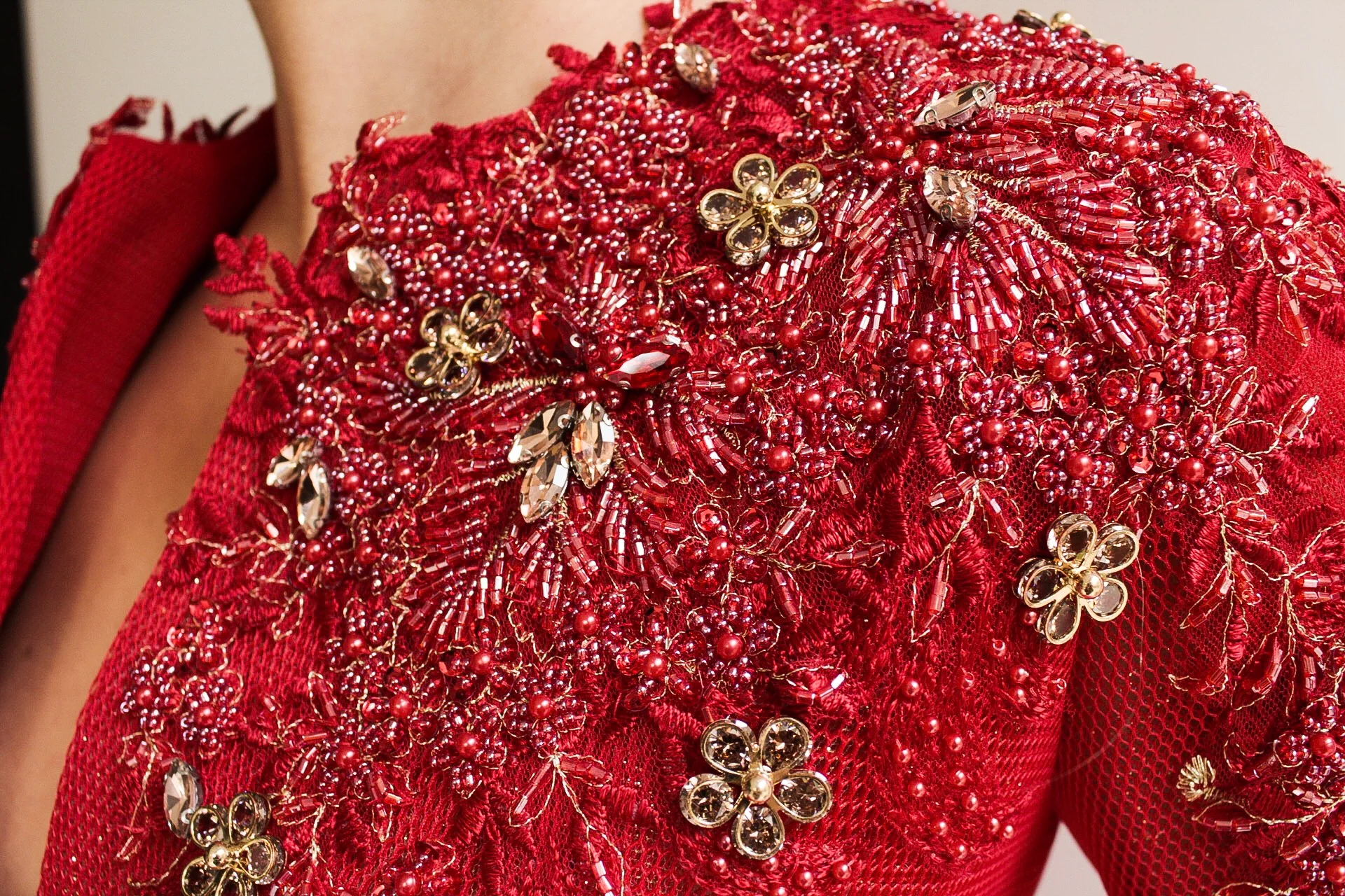 - Handmade embroidered flowers and crystals