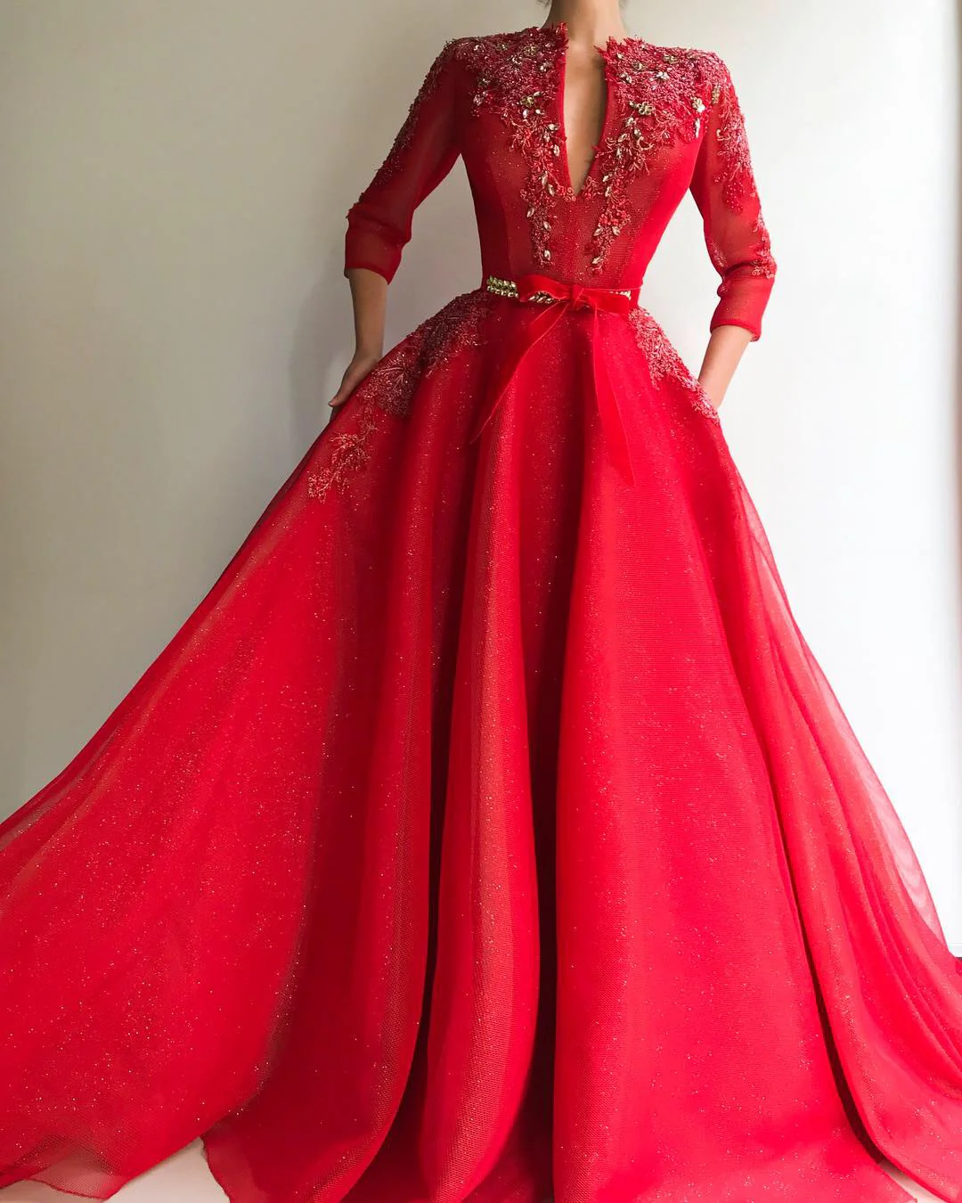 - Belt design with handmade crystals and red velvet ribbon