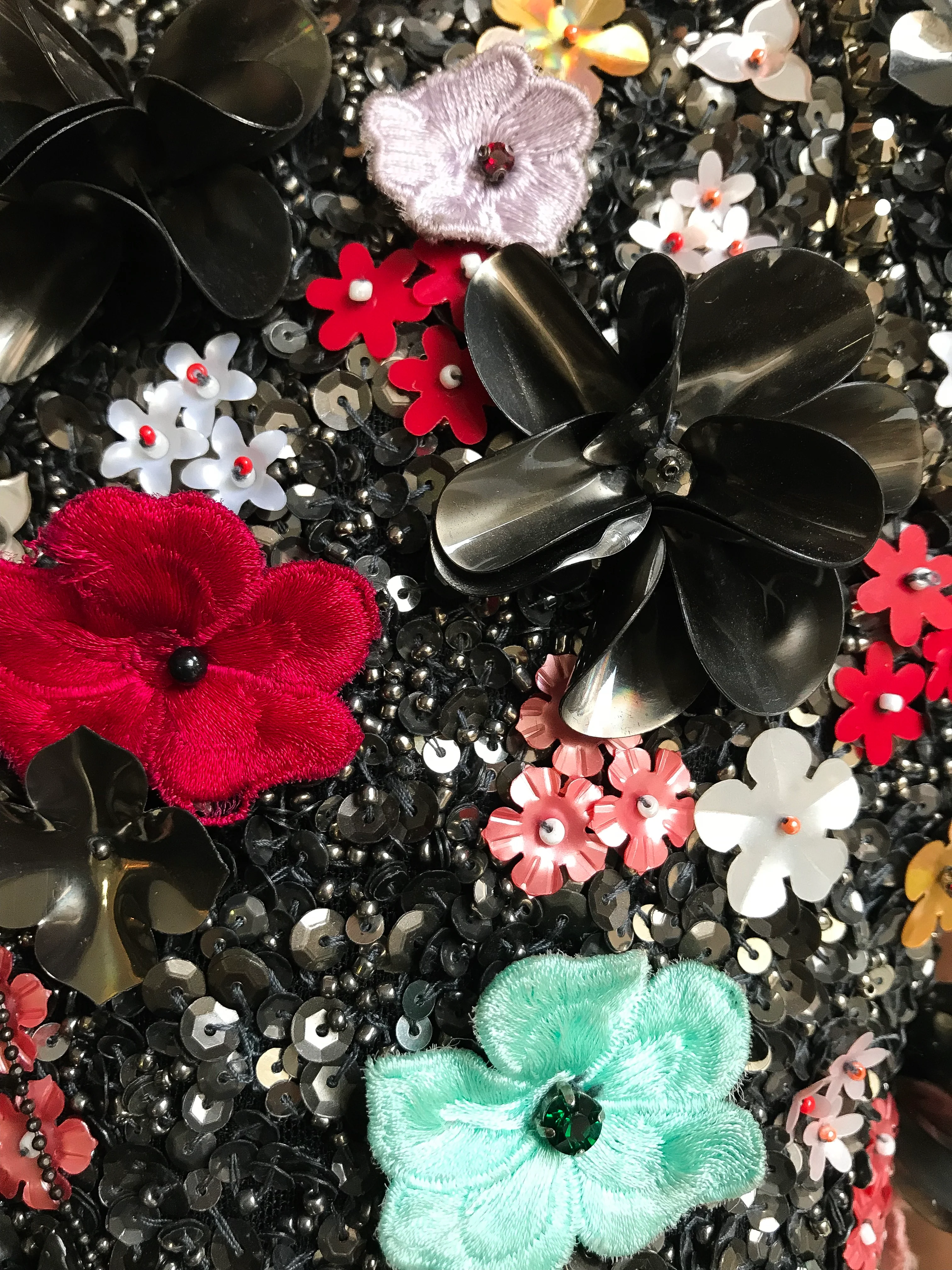 - Handmade embroidered buttercup and wood anemone flowers, sparkly metallic details