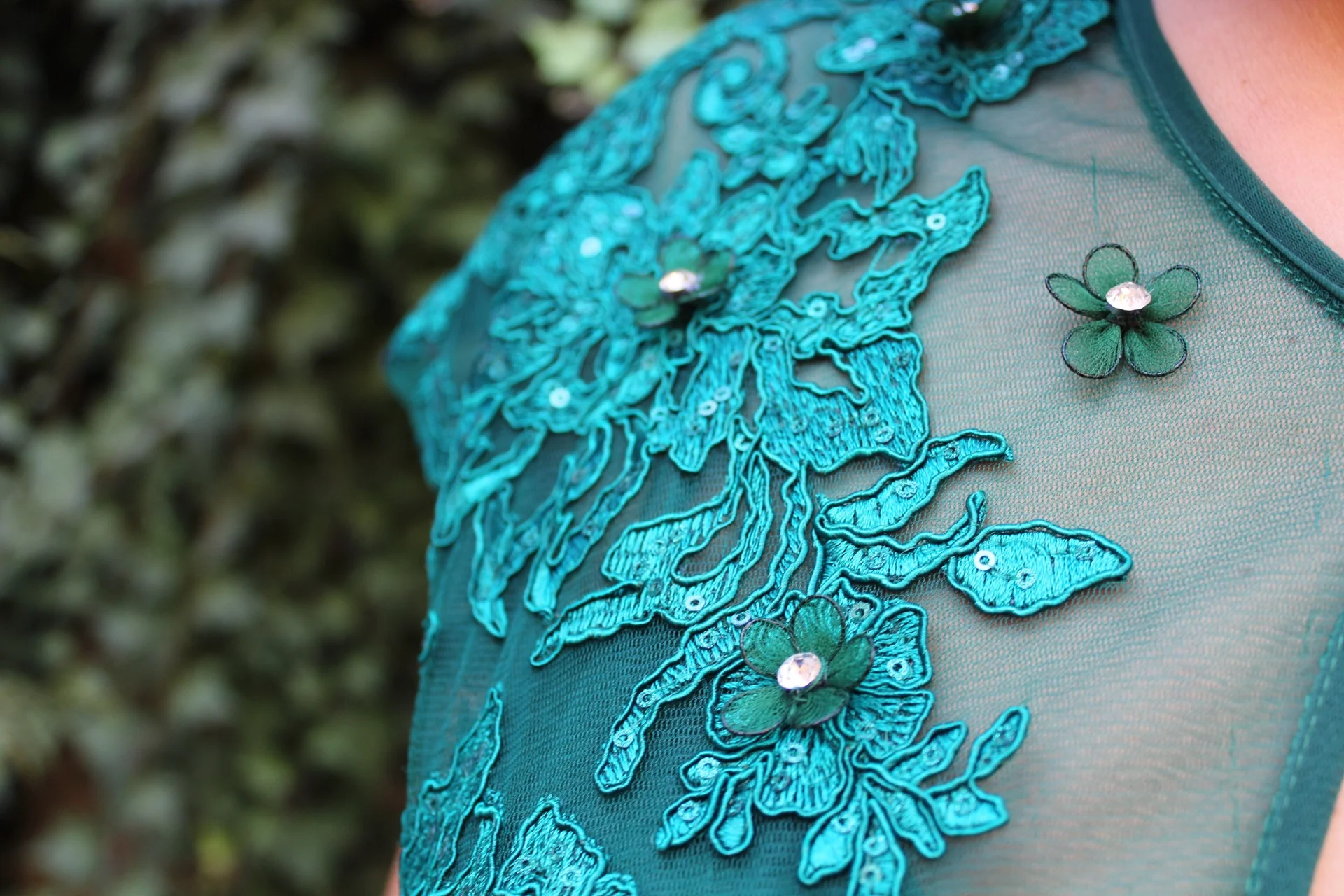 - Embroidered flowers and velvet belt detail