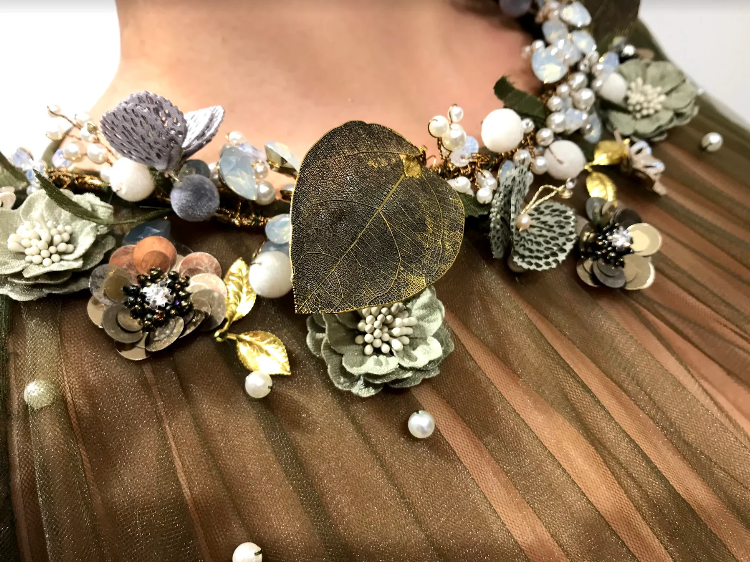 - Handmade embroidered flowers and leaves