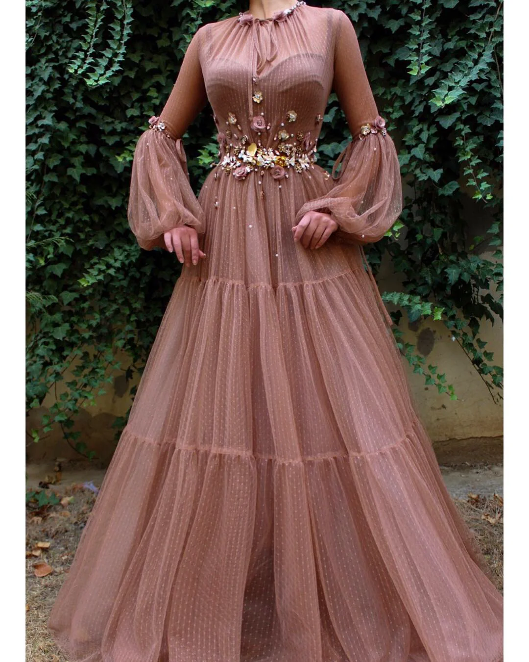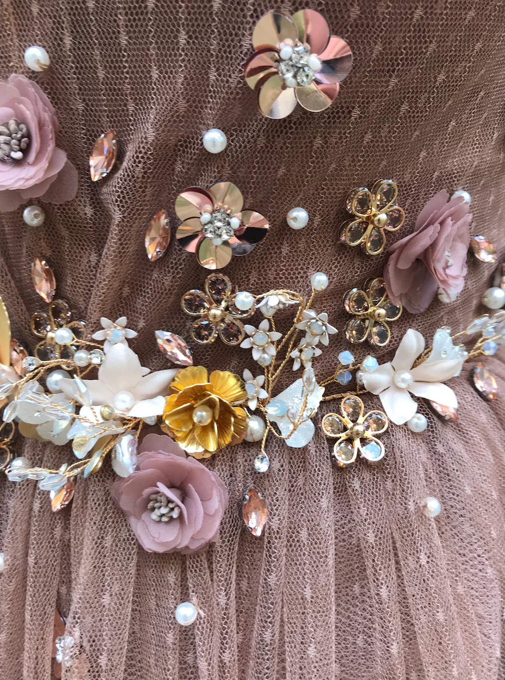 - Handmade embroidered flowers and crystals