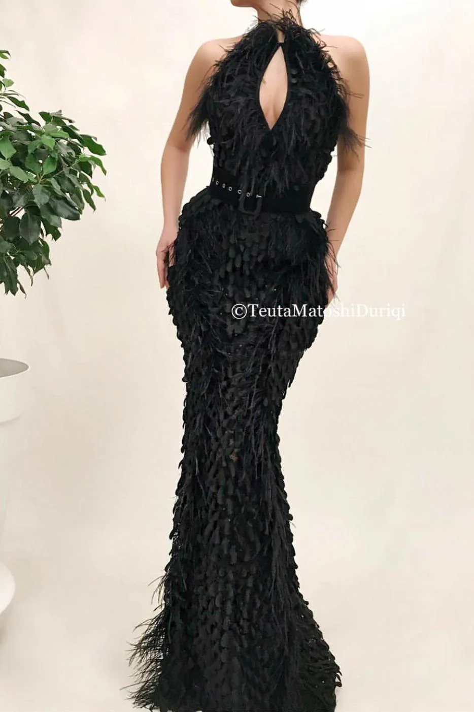 - Handmade embroidered black leaves with feathers