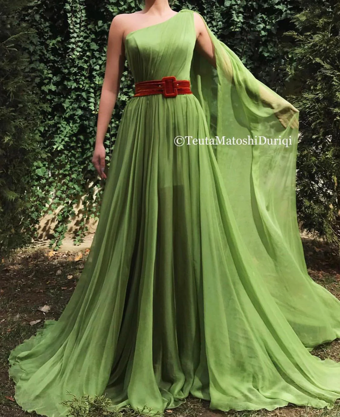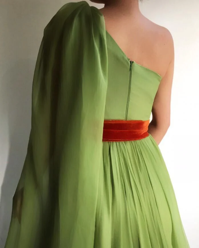 - One shoulder gown with waist definition and an open leg