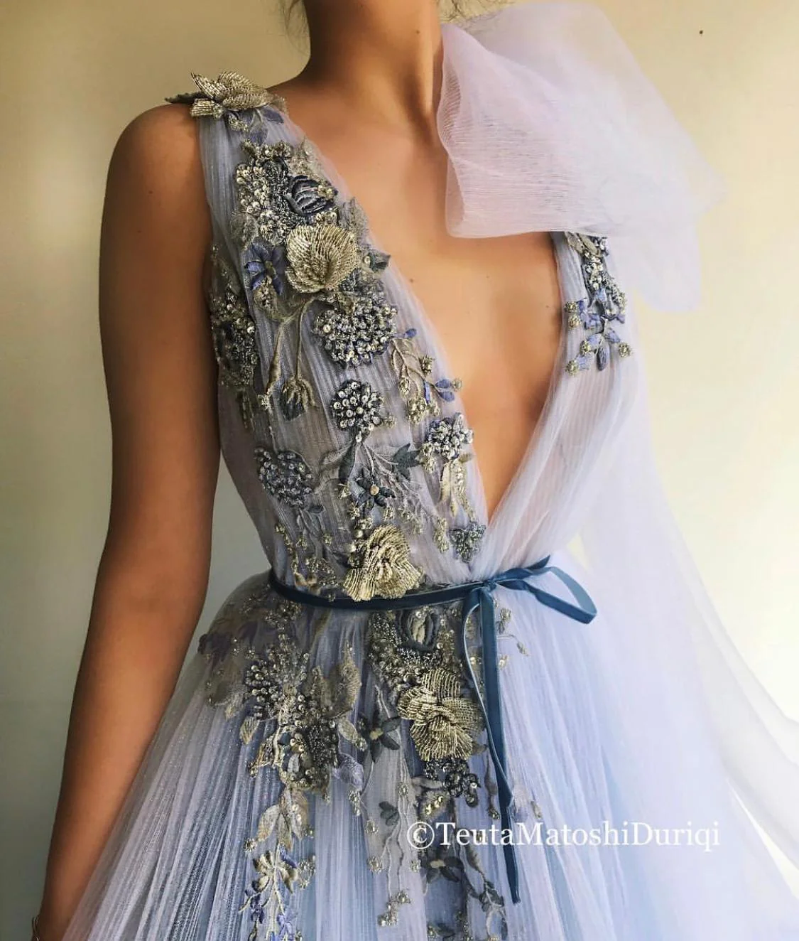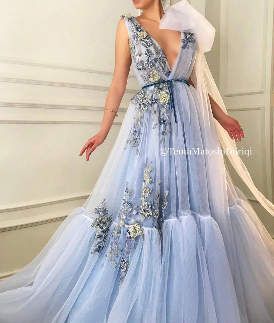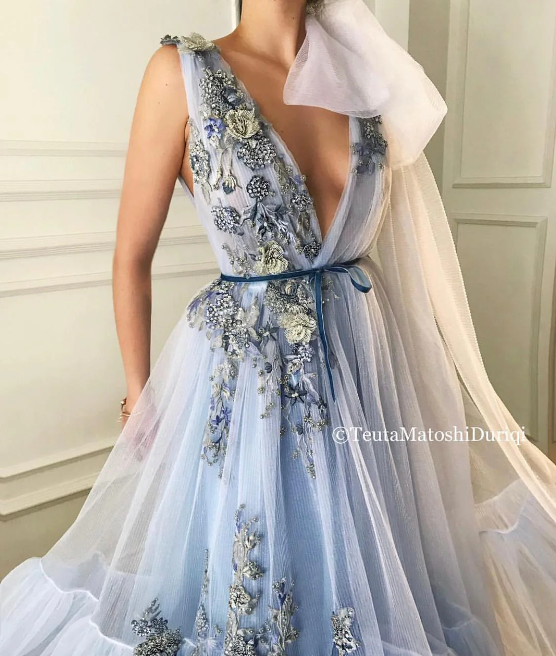 - Handmade embroidered blue and silver shiny flowers and a blue ribbon
