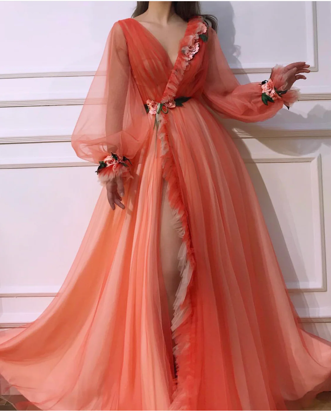 - A-line dress shape with waist definition, long sleeves and V-neck