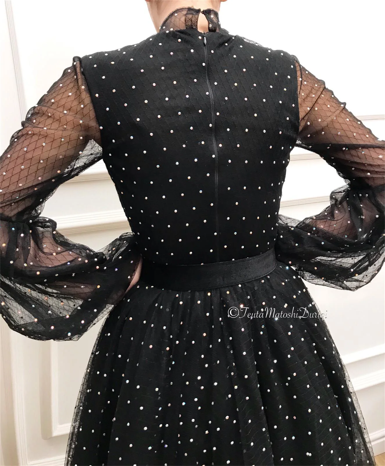 - Shiny details all over the dress with a sparkling ribbon on the neck and a black belt detail