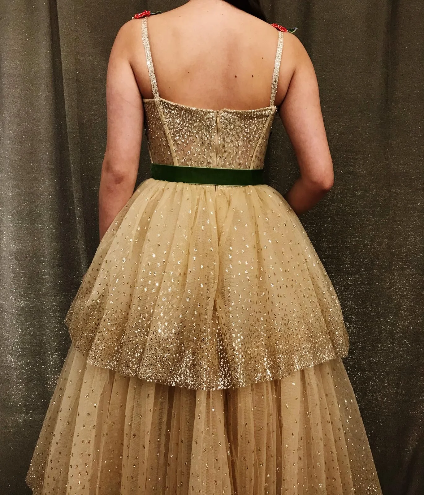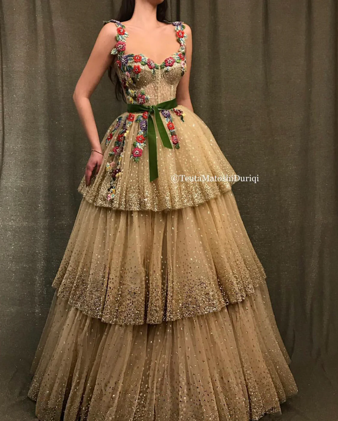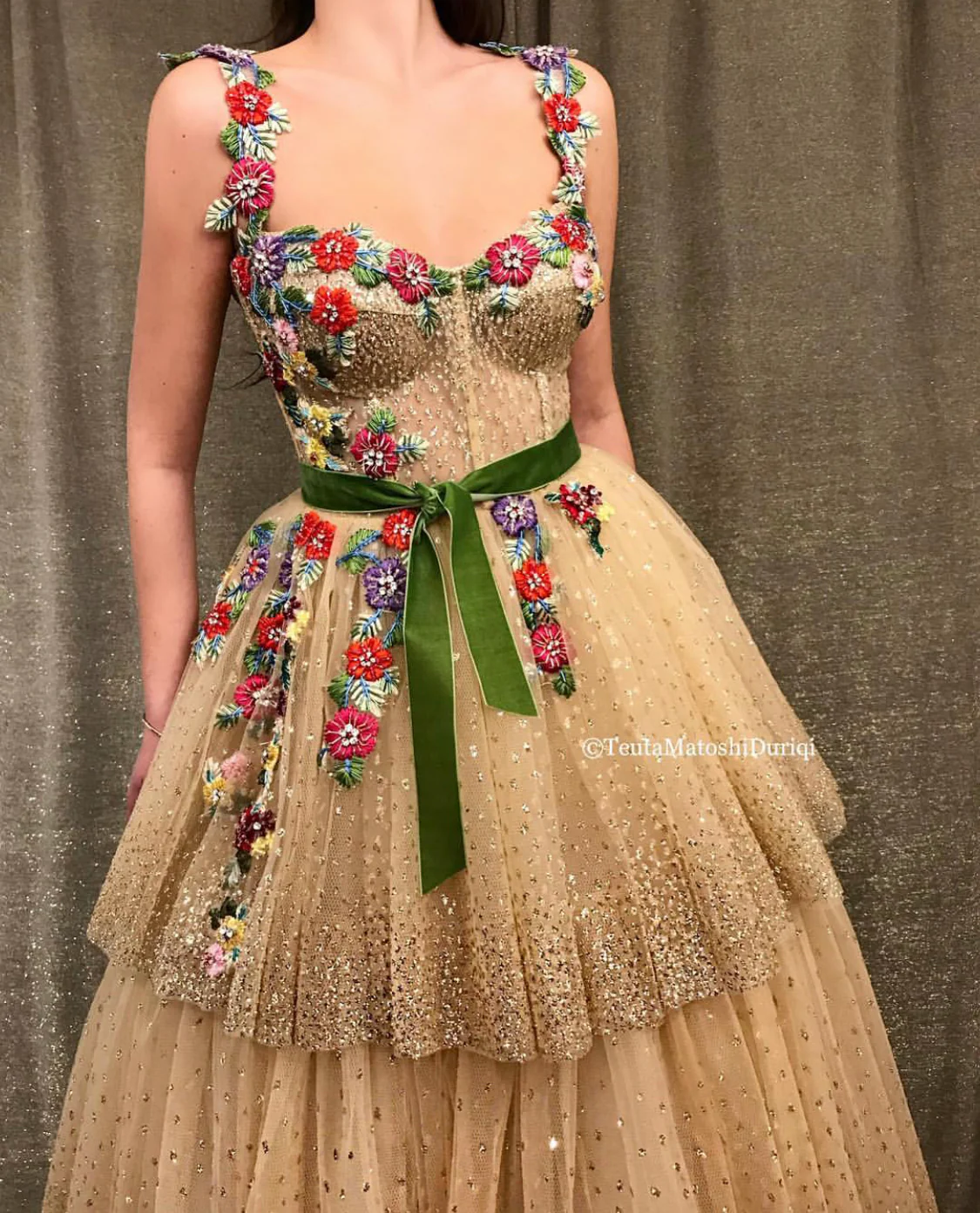 - Handmade embroidered flowers, green velvet belt