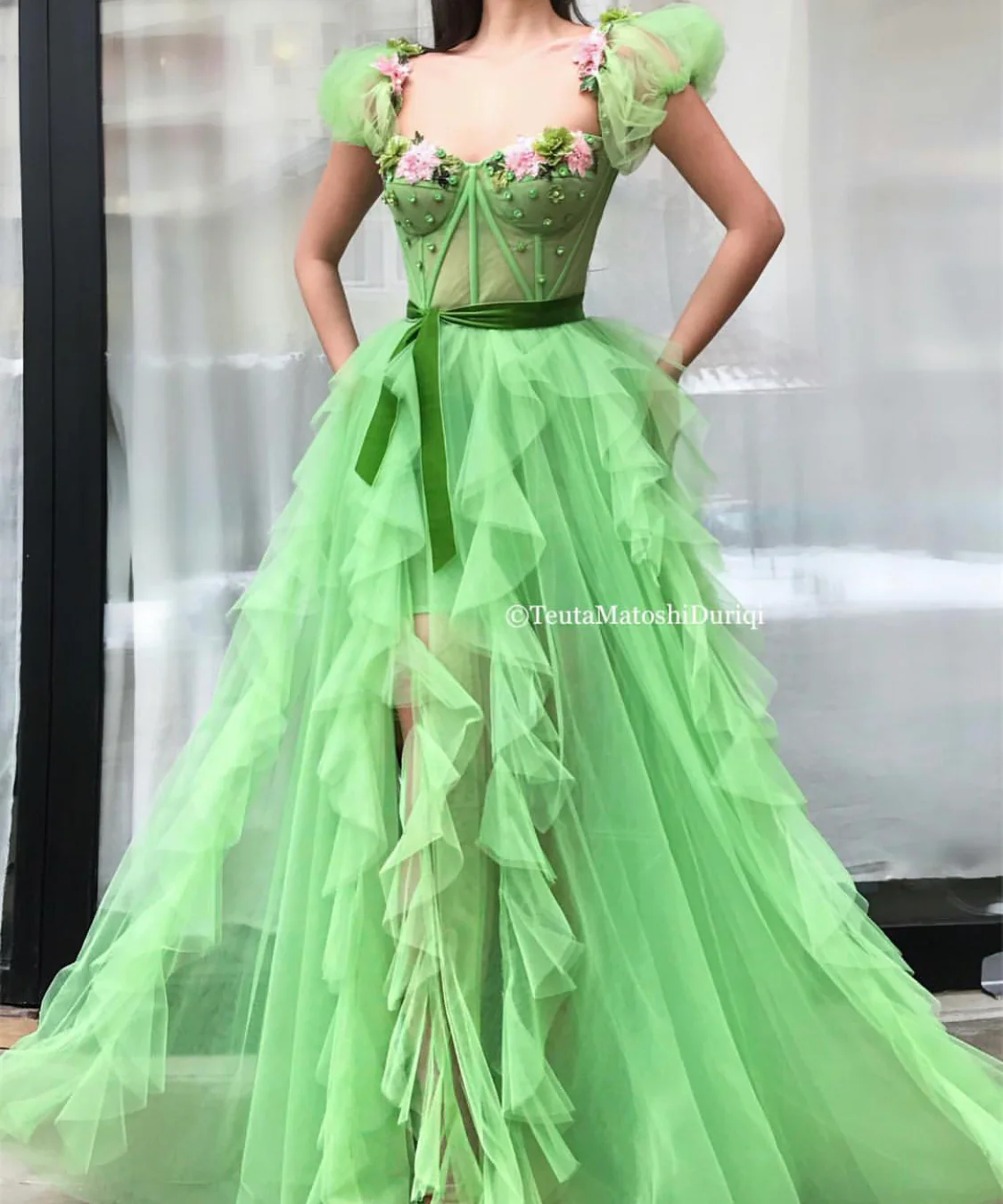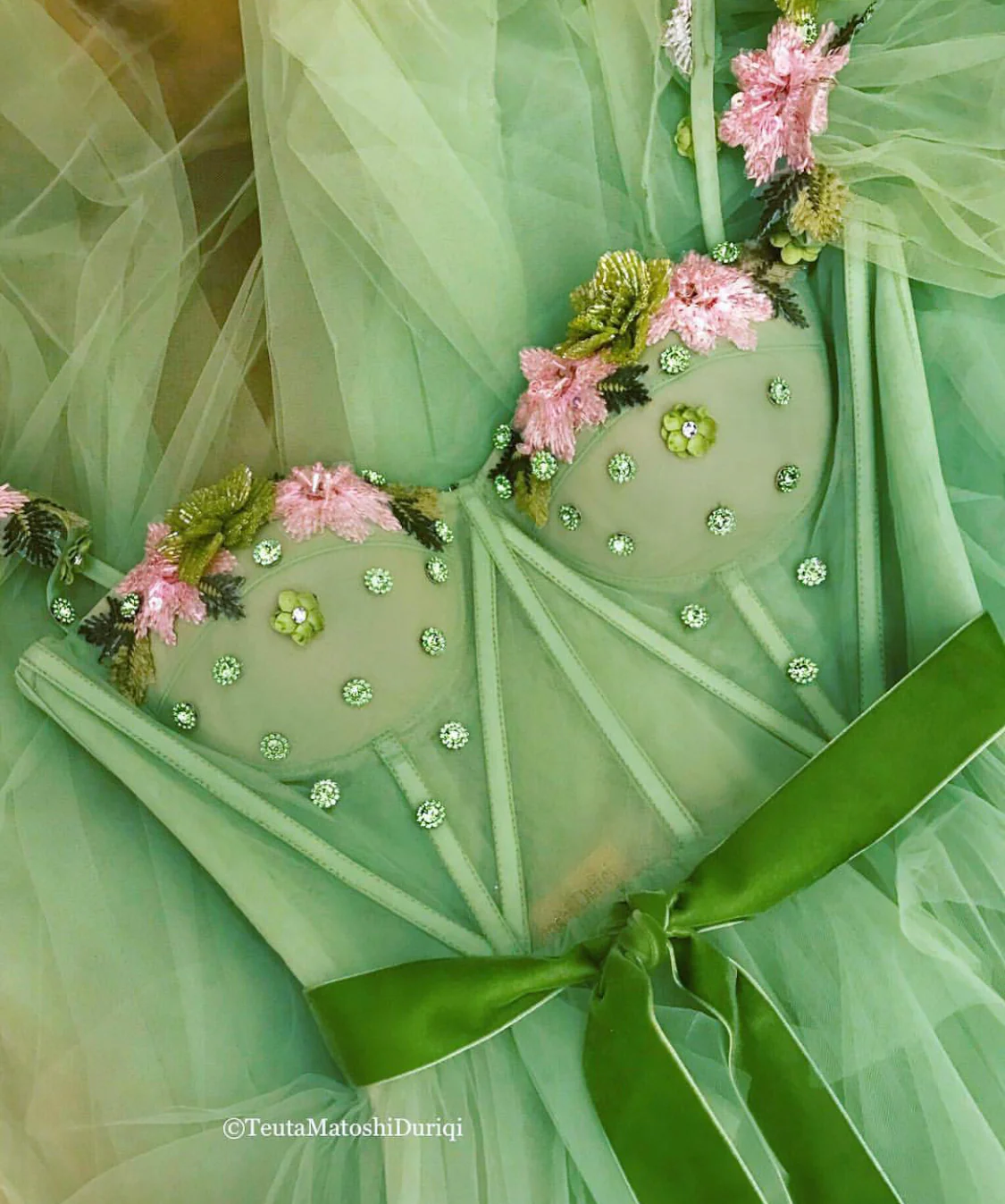 - Pink and green embroidered flowers,crystals and a green velvet belt