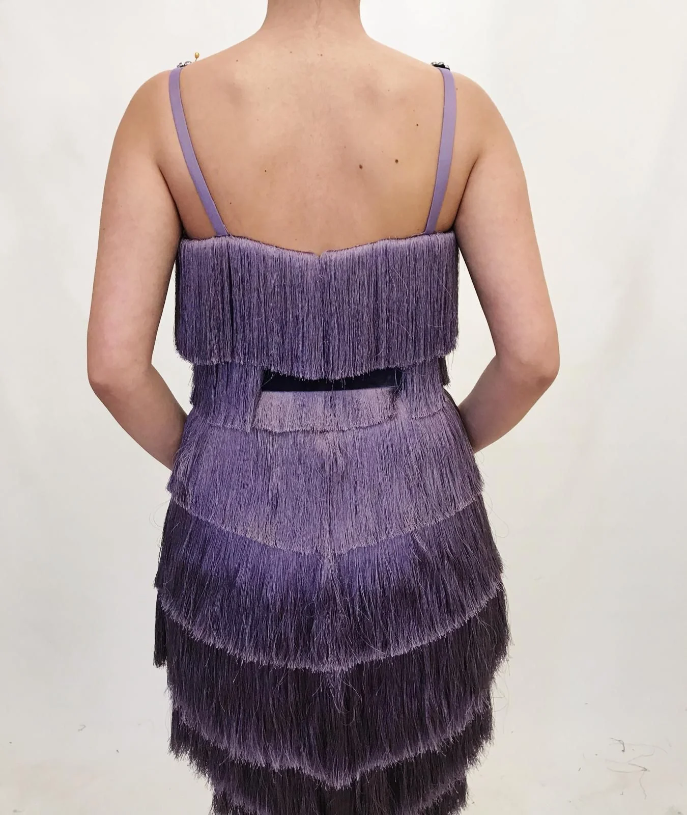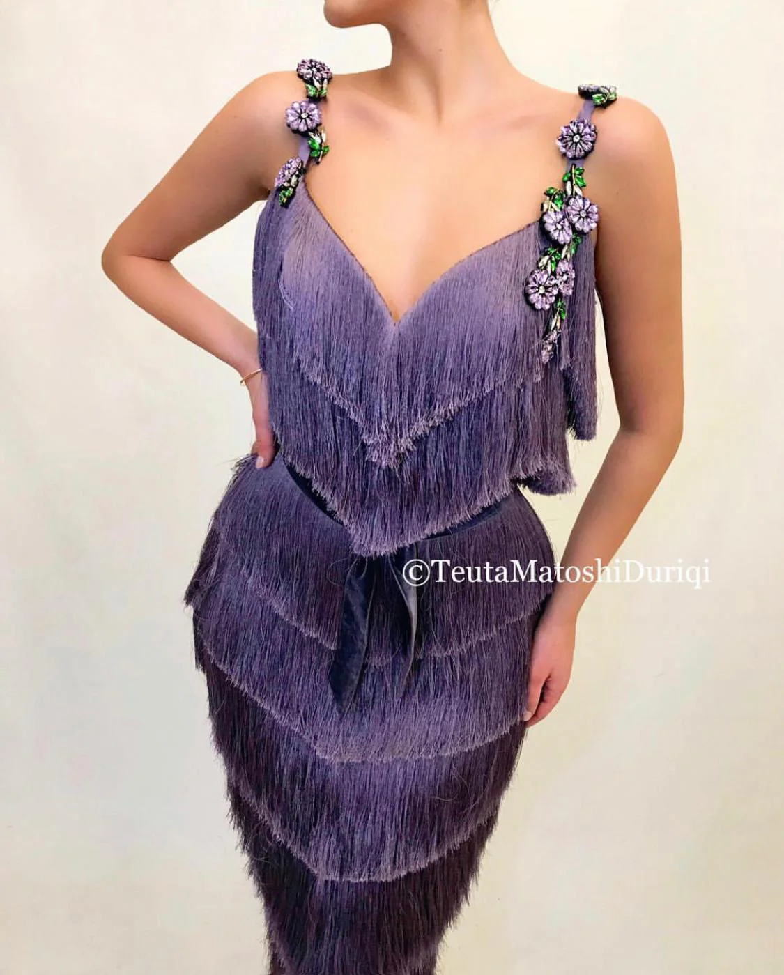 - Embroidered crystal flowers and velvet belt