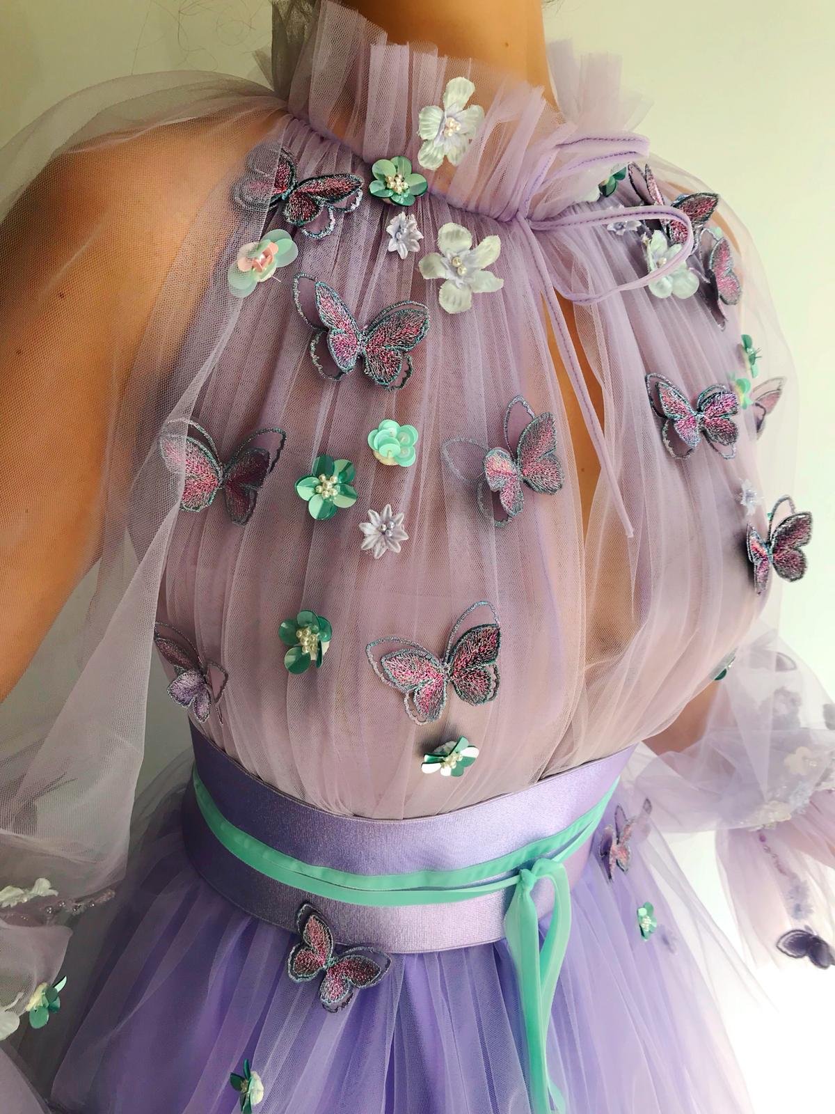 - Embroidered handmade blossoming butterflies and flowers on top of the dress with a ribbon detail on waist
