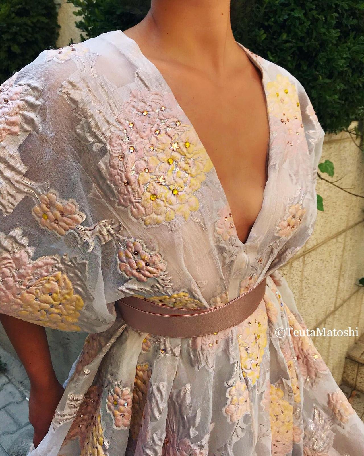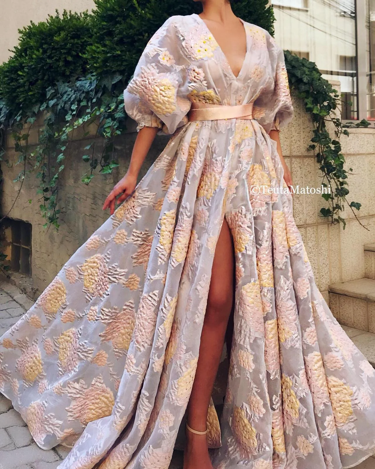 - A-line dress with and open leg, puffy sleeves and V-neck