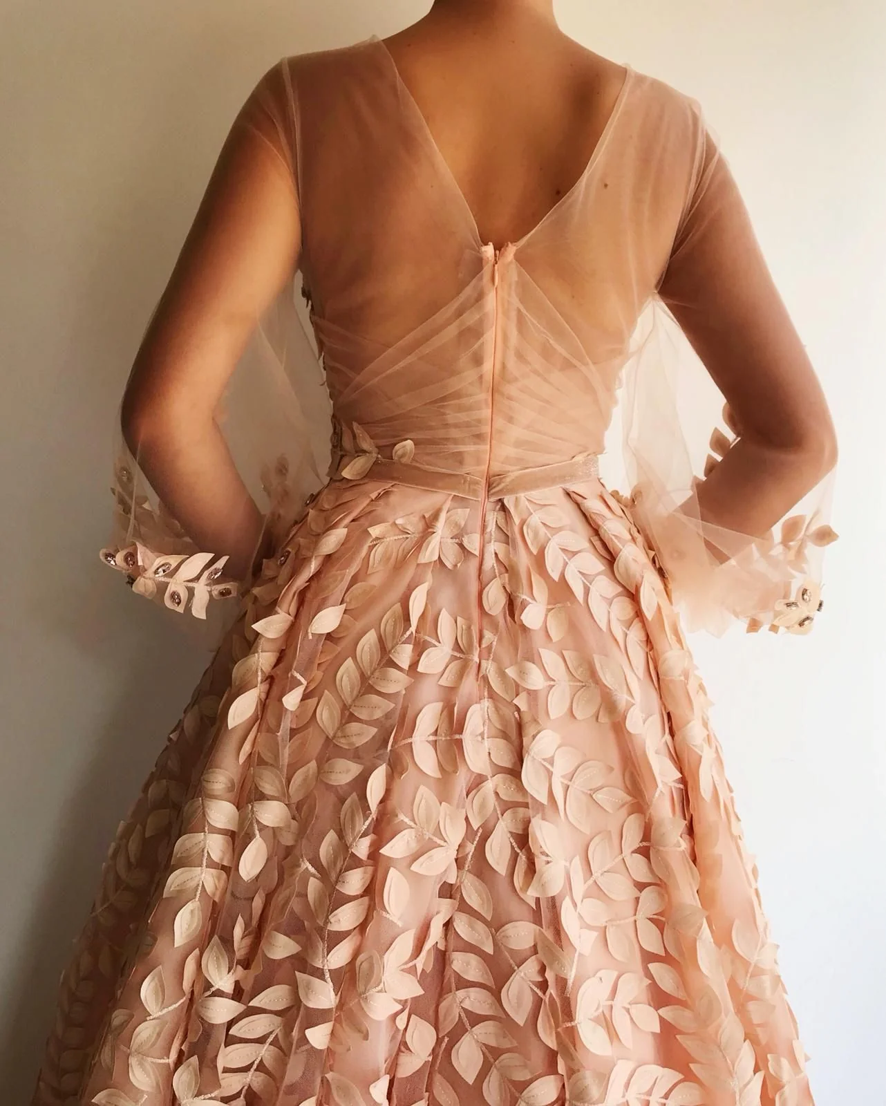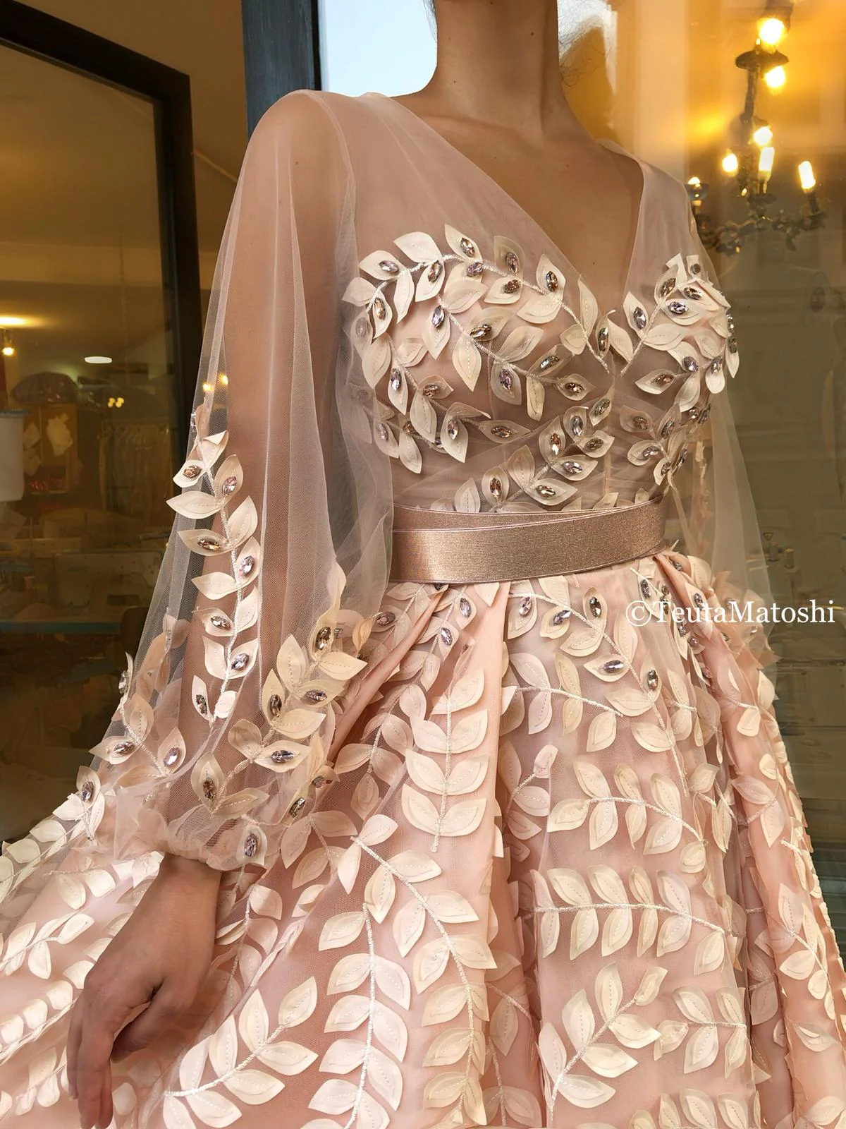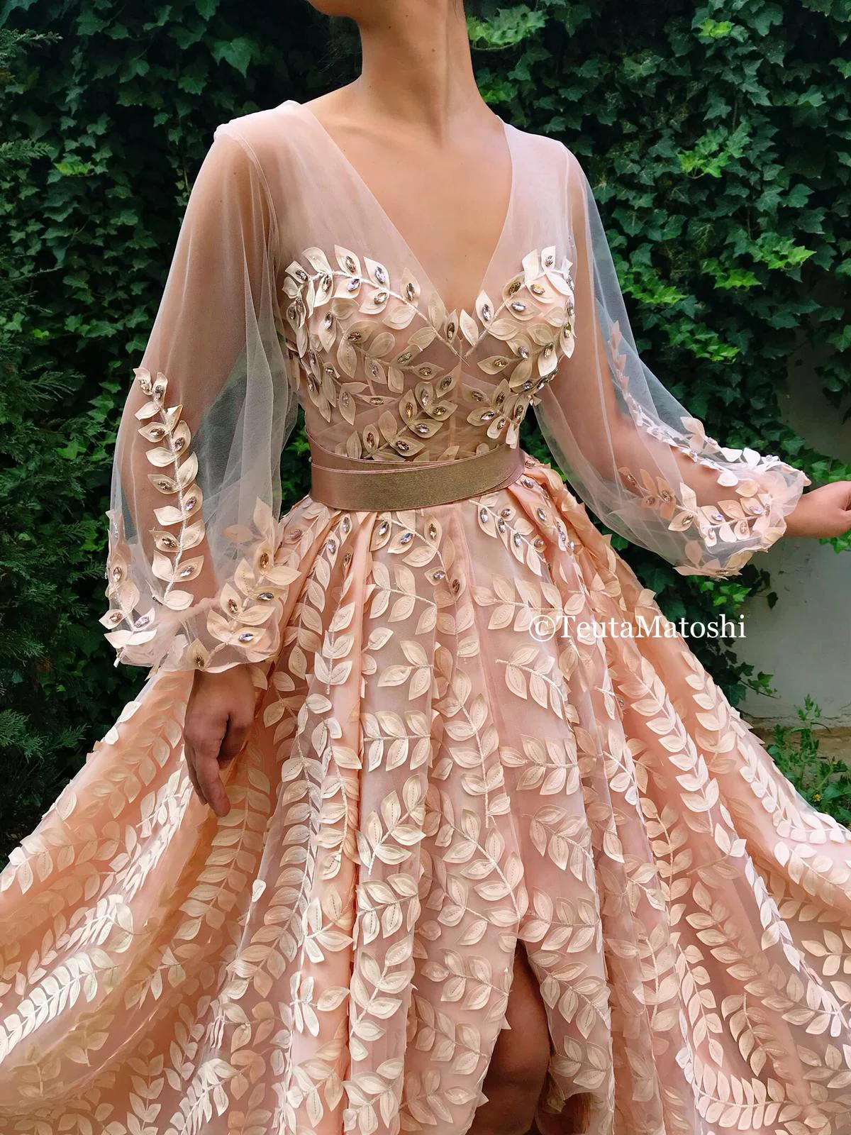 - A-line dress with and open leg, v-neck and long embroidered sleeves