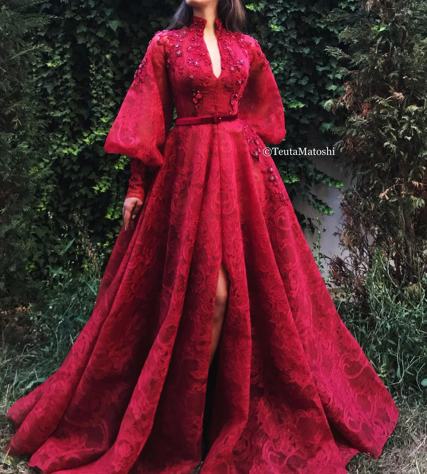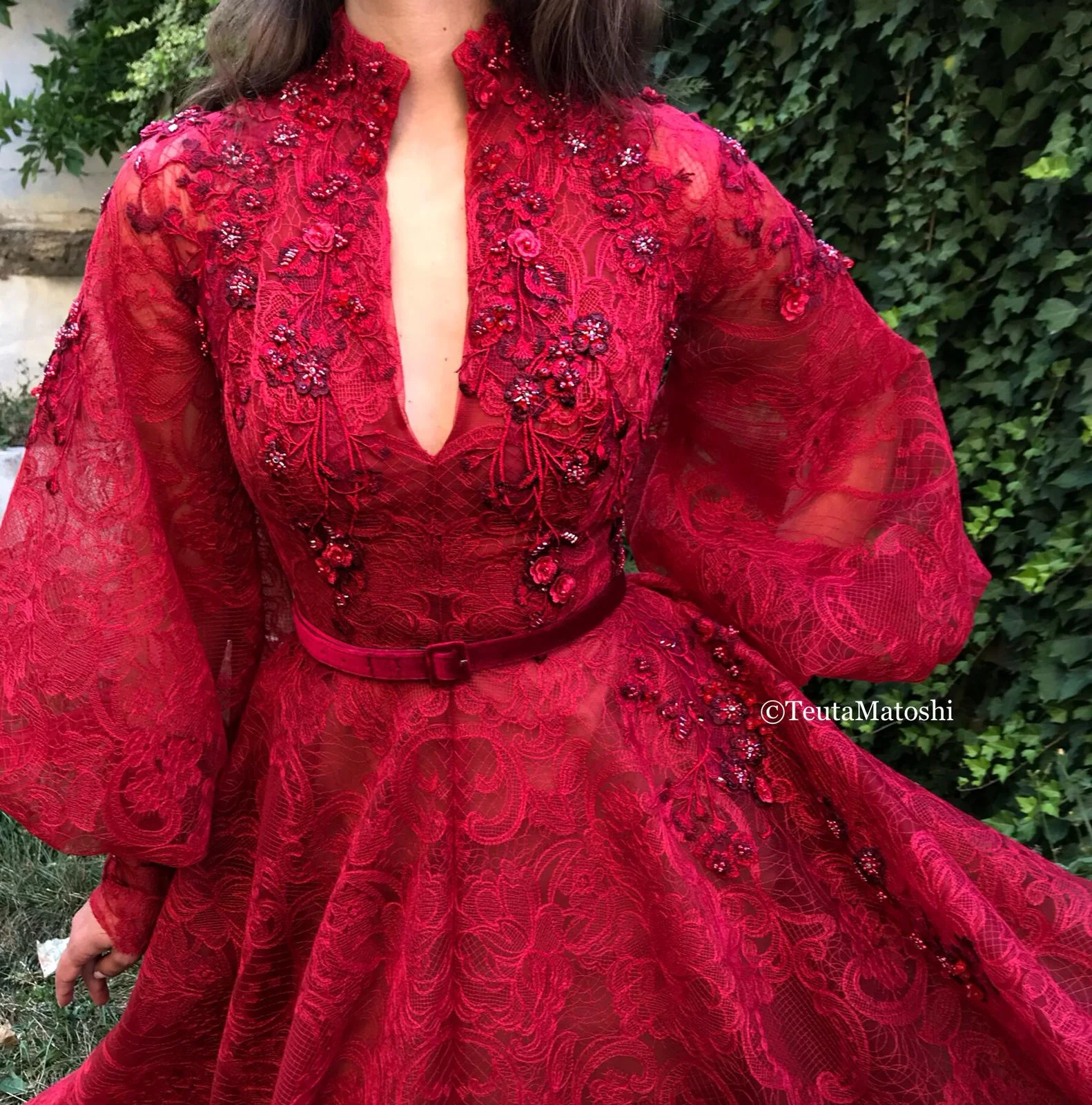 - Embroidered red flowers on top of the dress and a red velvet belt detail
