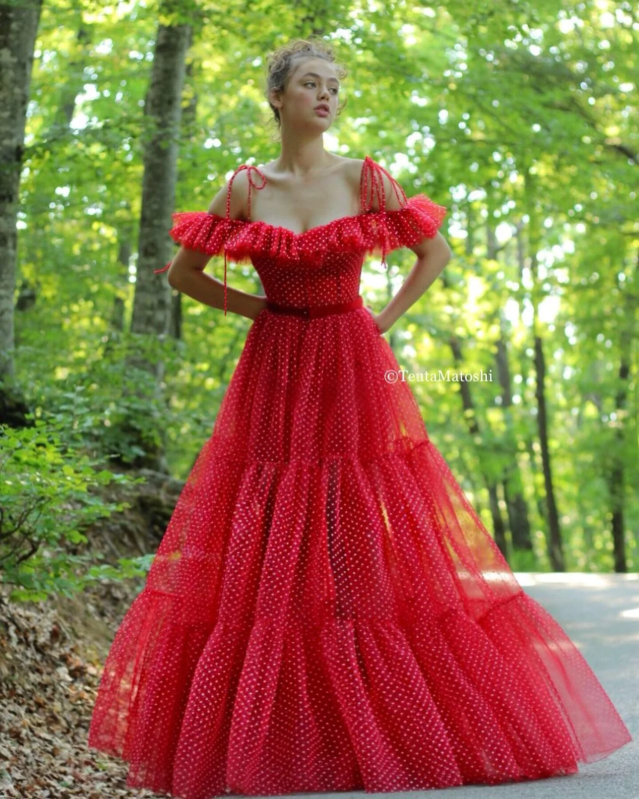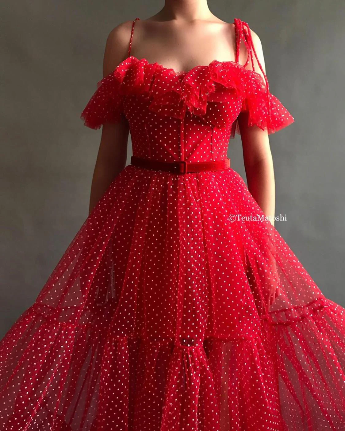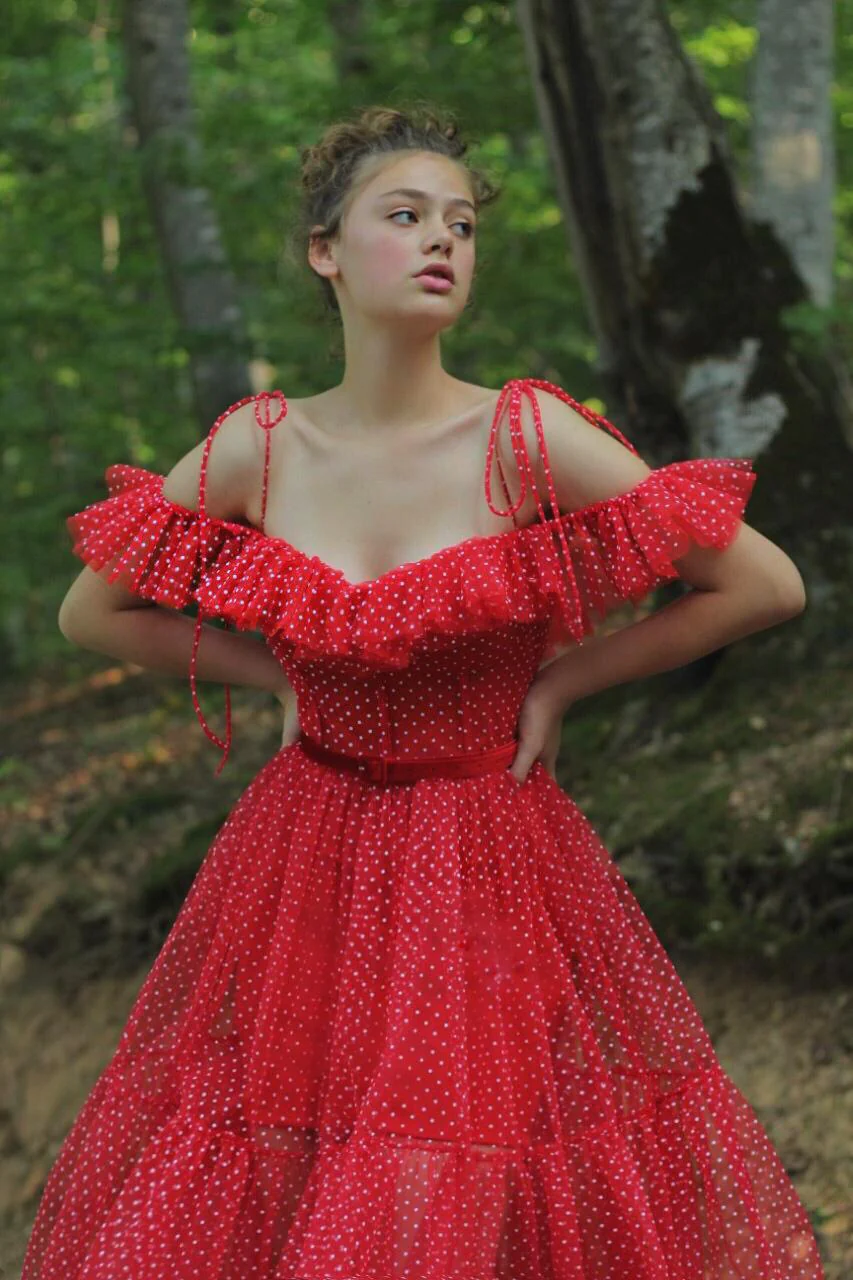 - Off-shoulder style with butterfly sleeves and a red velvet belt detail