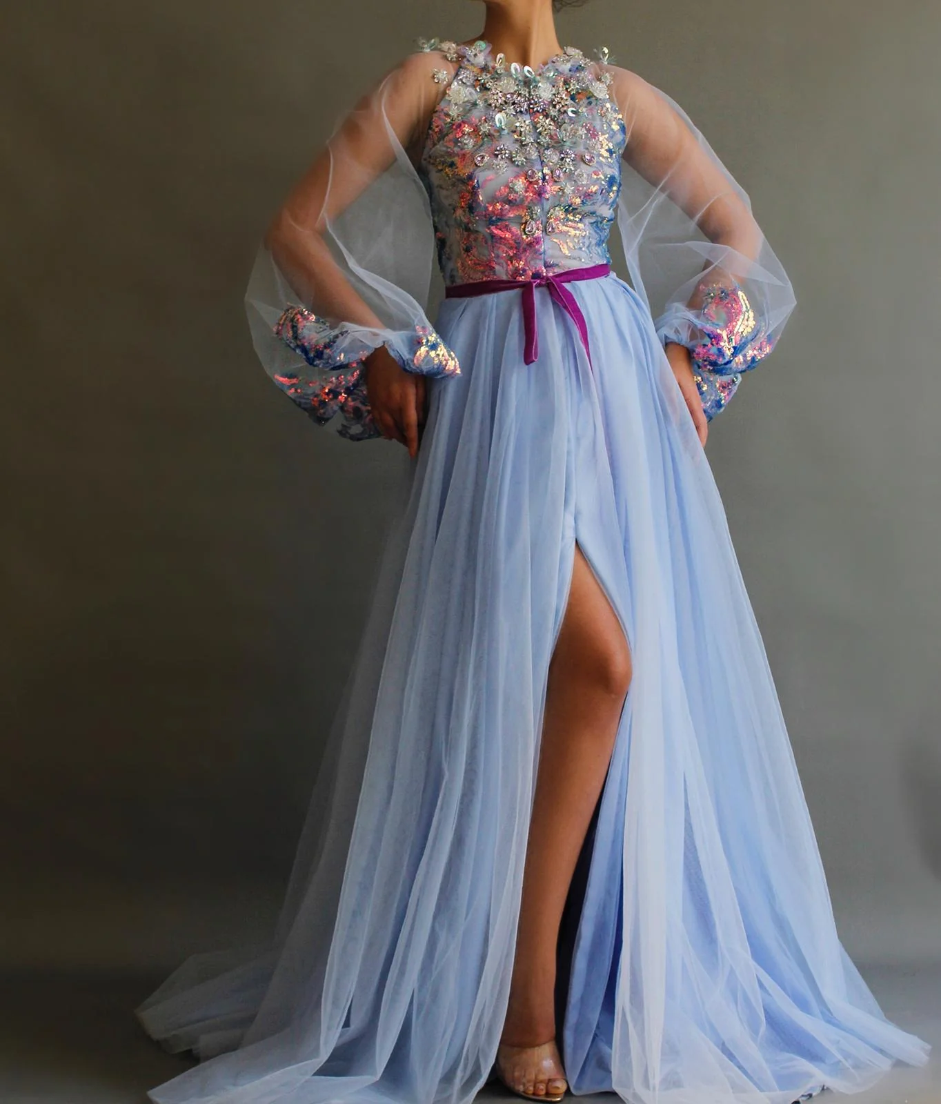 - A-line dress with long sequined sleeves and a purple ribbon