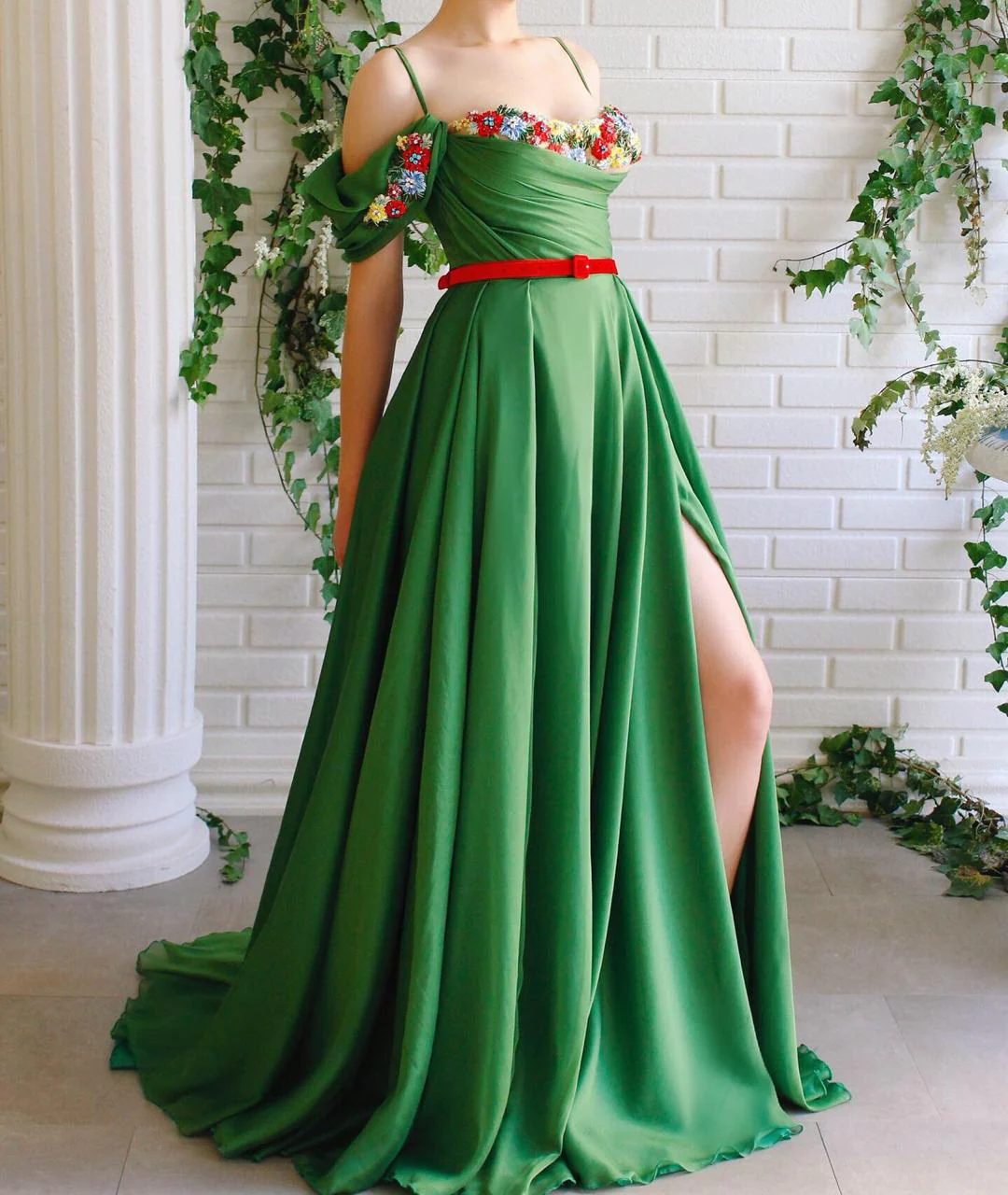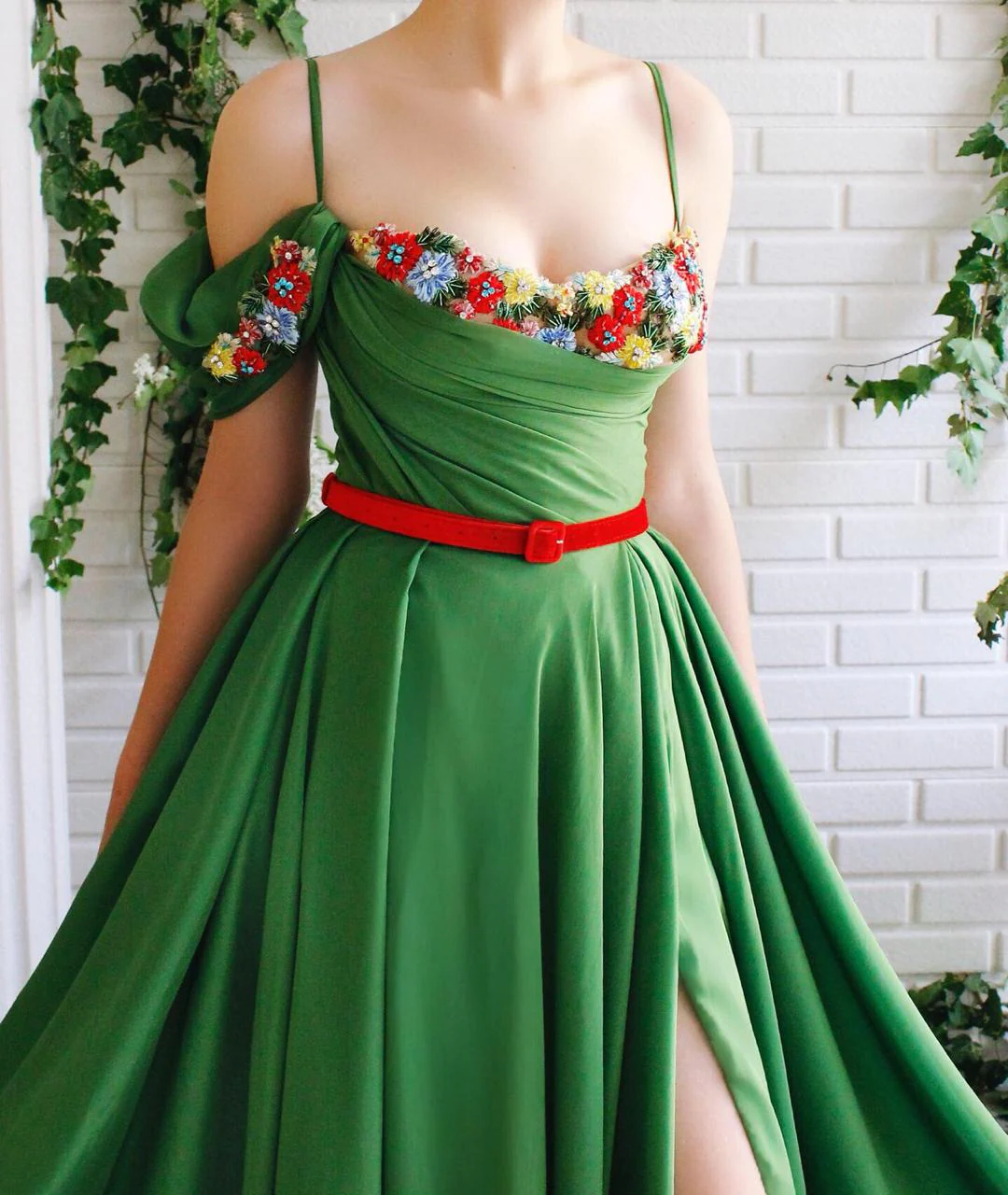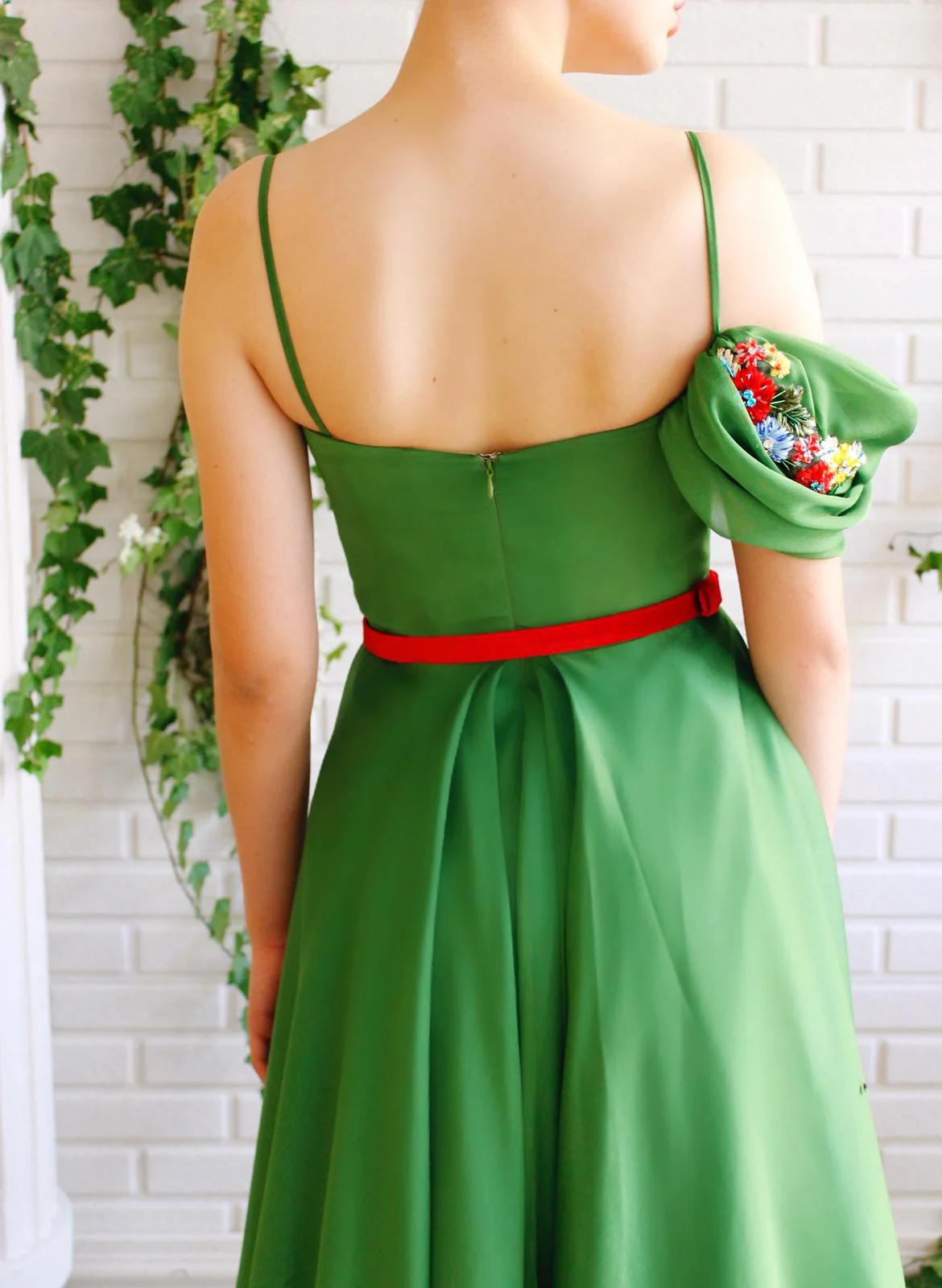 - Embroidered flowers with crystals on top of the dress with red velvet belt