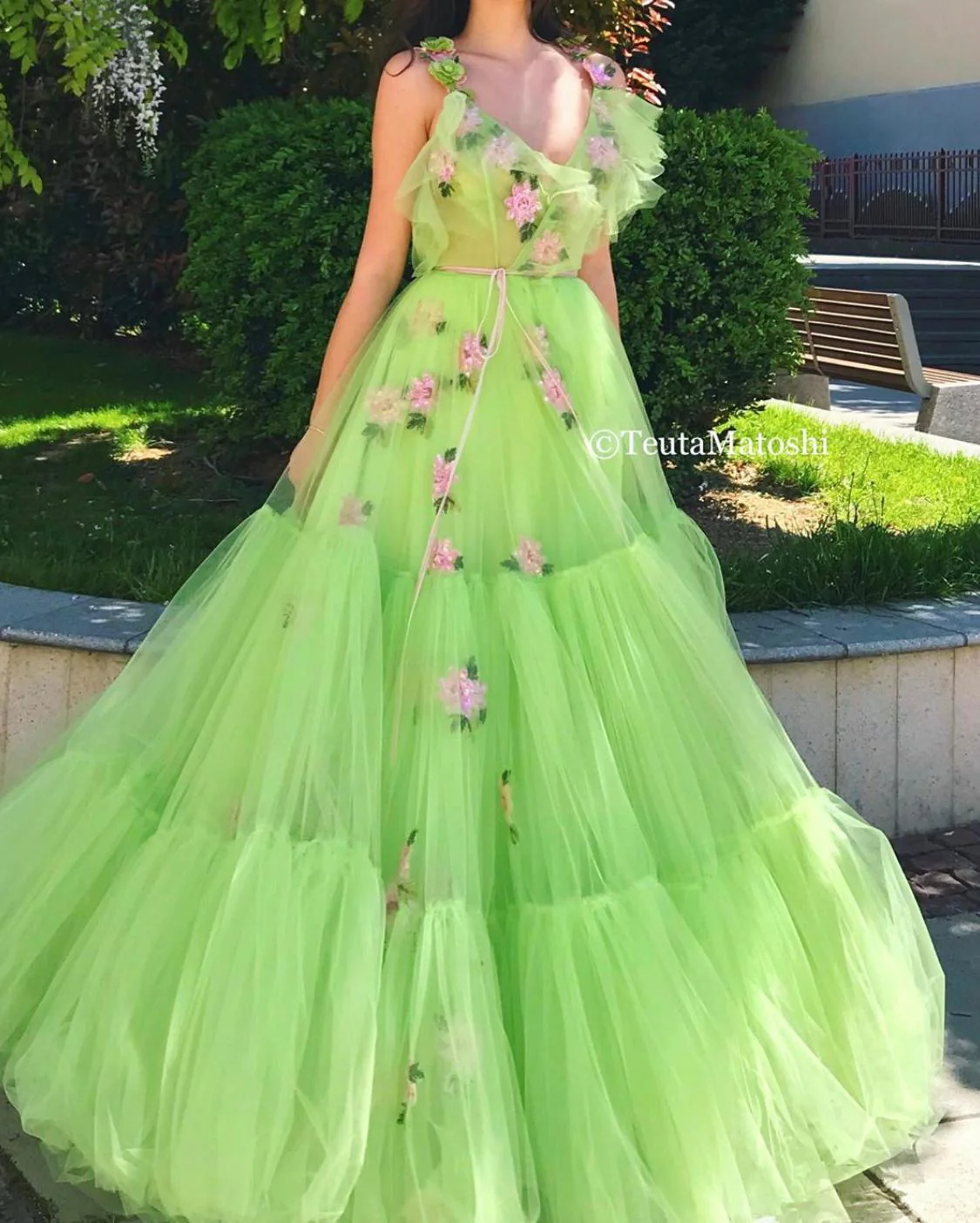 - Handmade embroidered pink flowers all over the dress with a green velvet ribbon