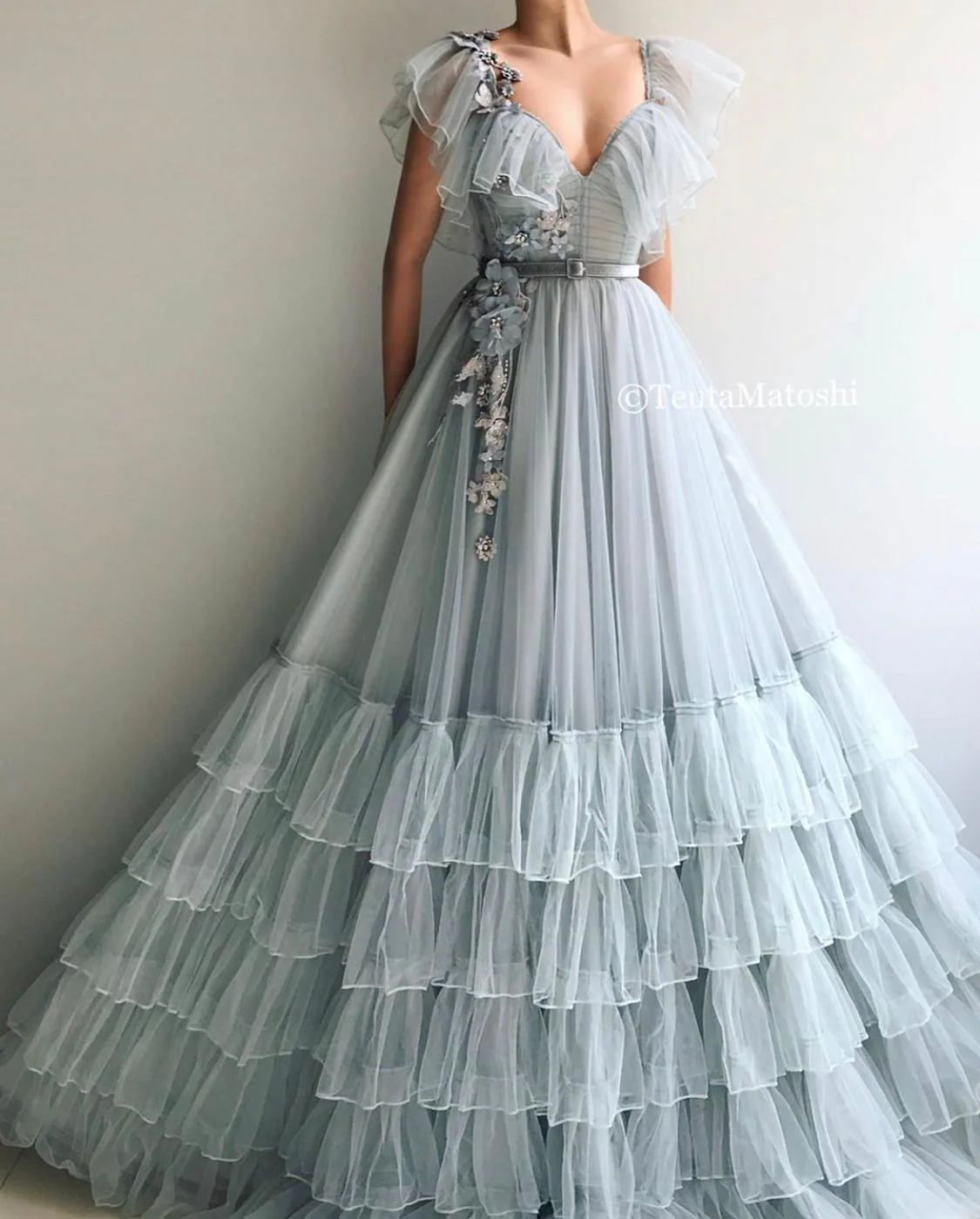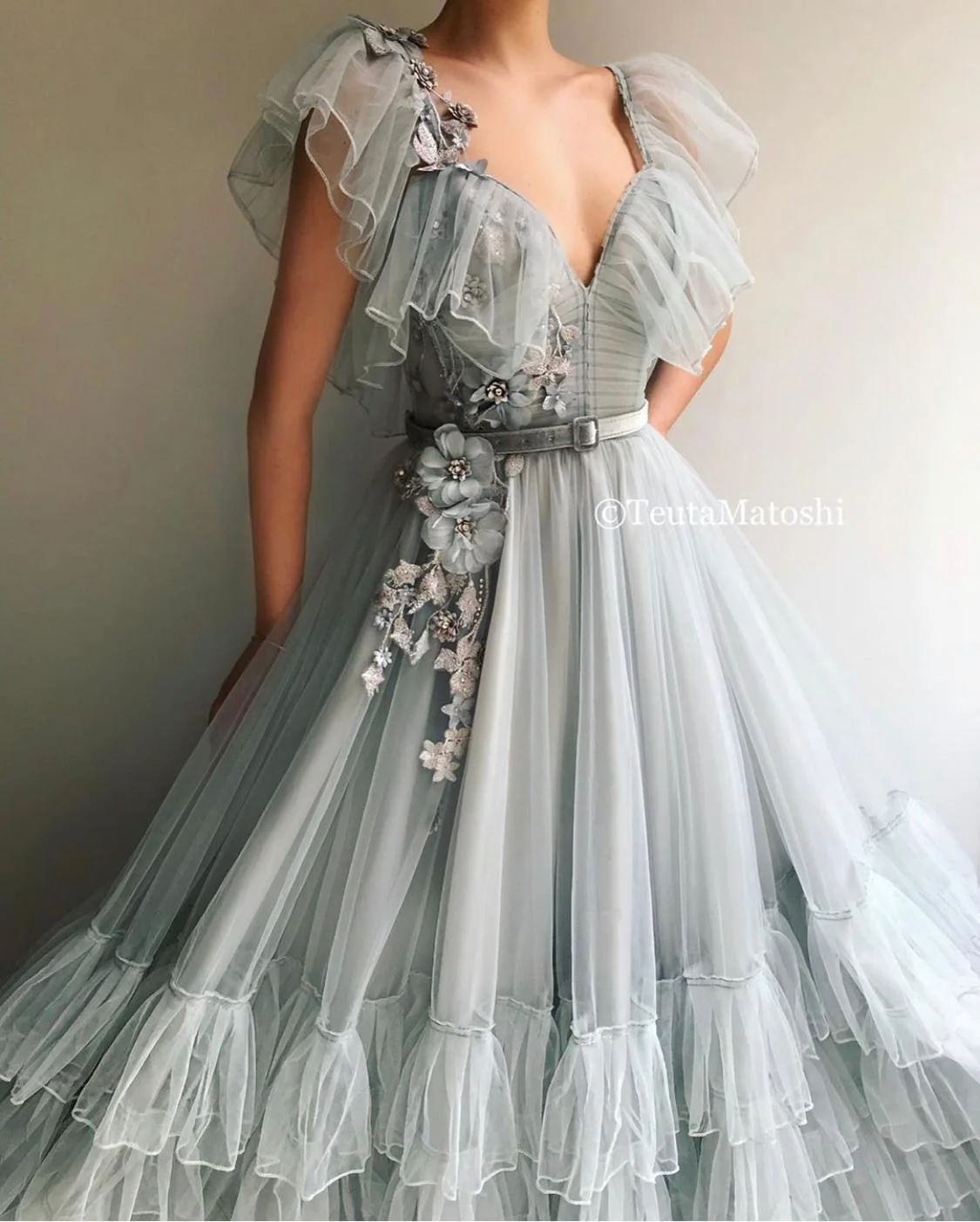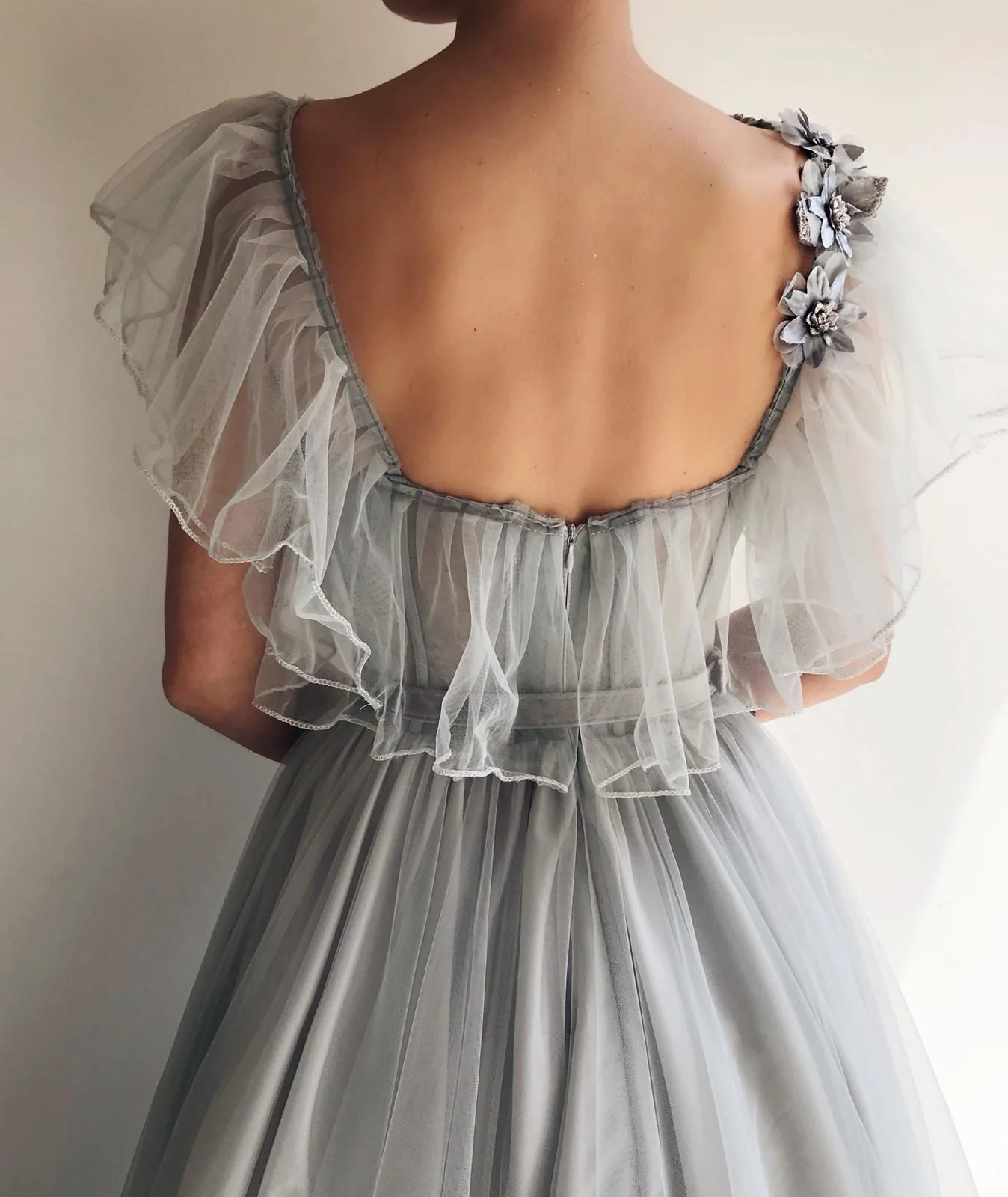 - Embroidered unique gray flowers with crystals and a velvet belt
