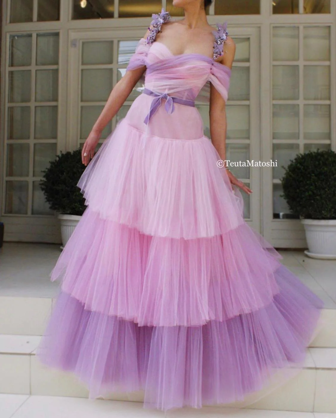 - Off-shoulder ball gown and a pink ribbon on waist