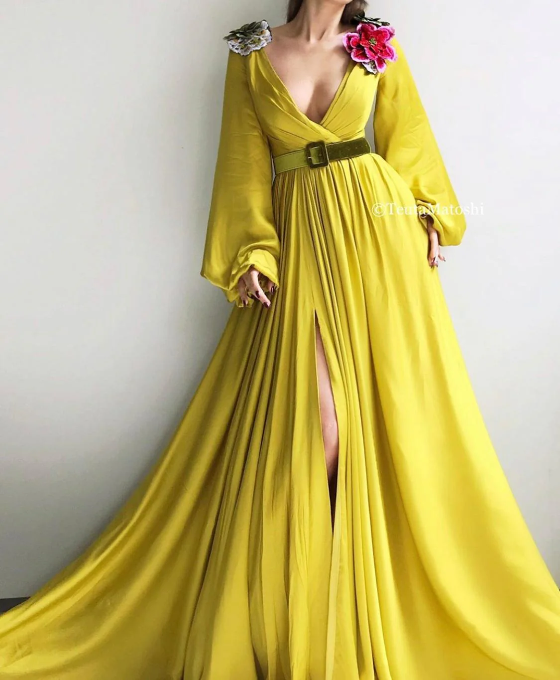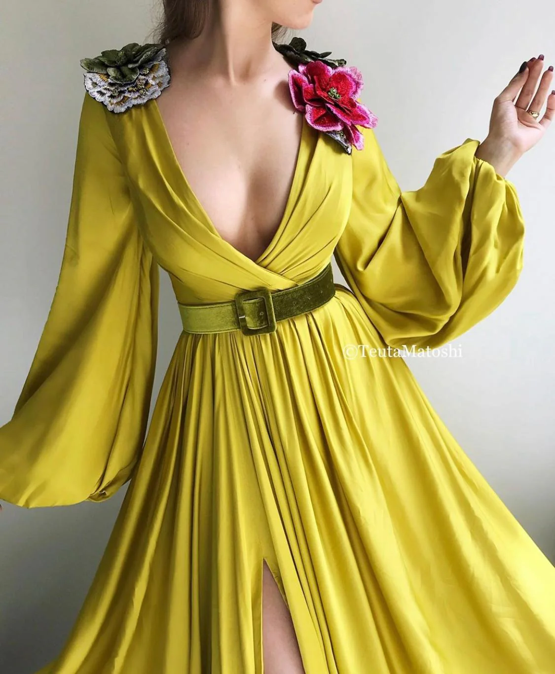 - Embroidered flowers on shoulders and a green velvet belt