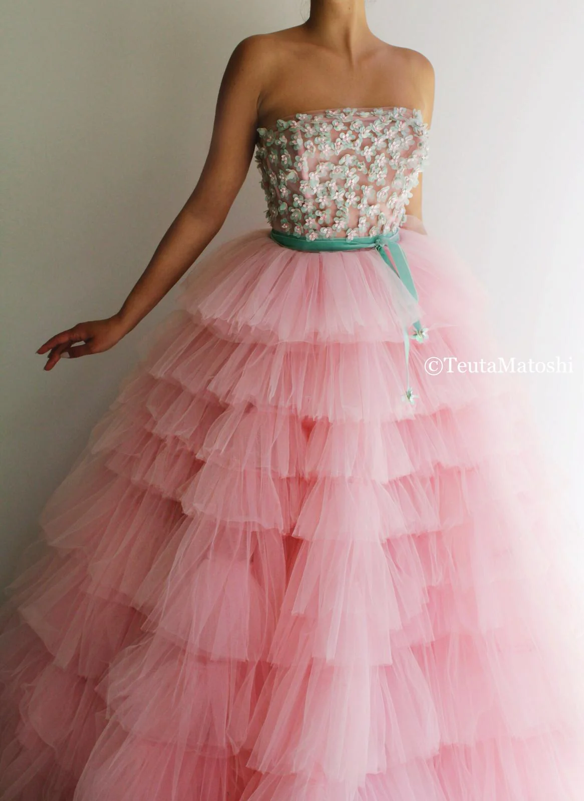 - Ball gown dress with waist definition and a mint velvet ribbon