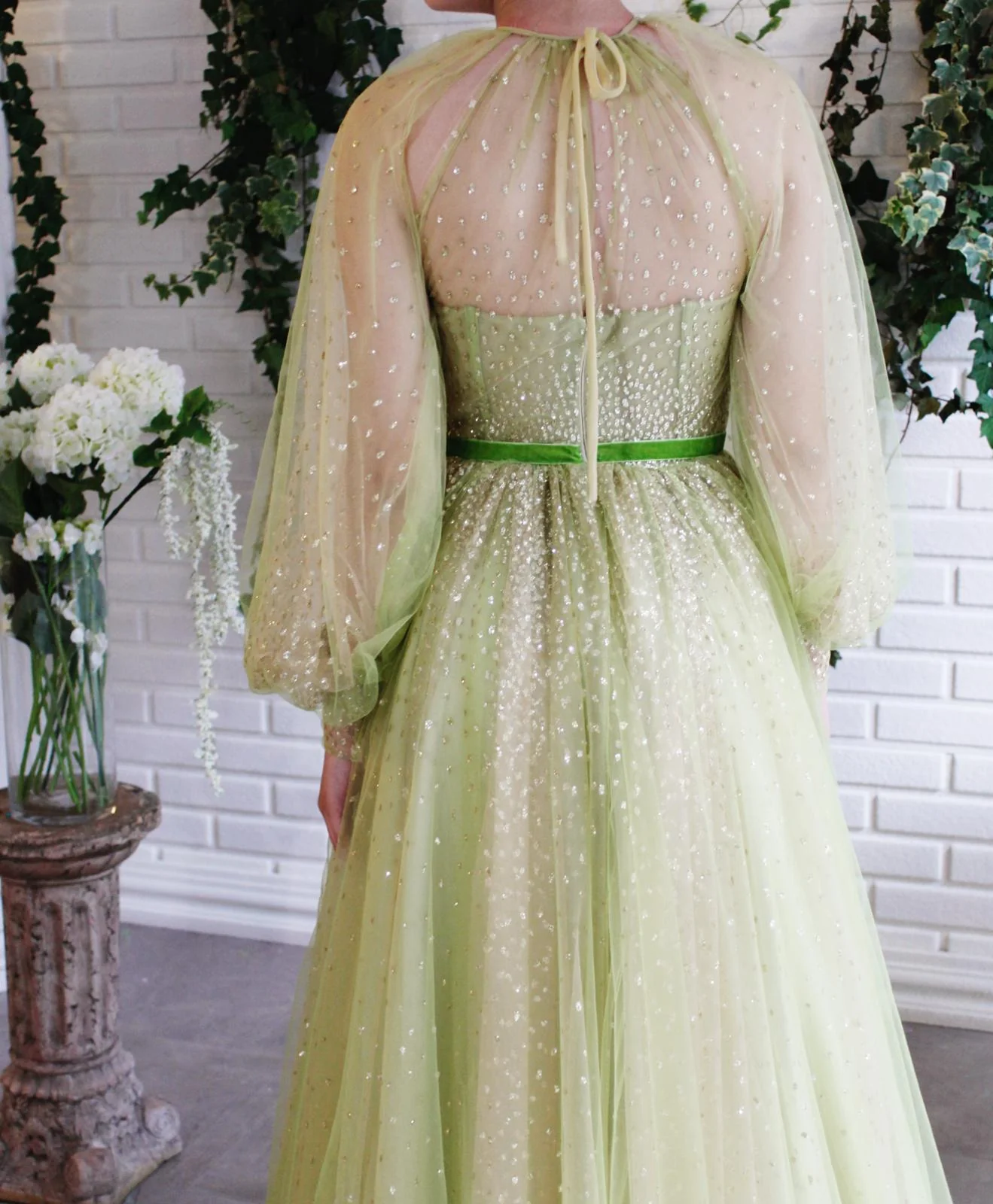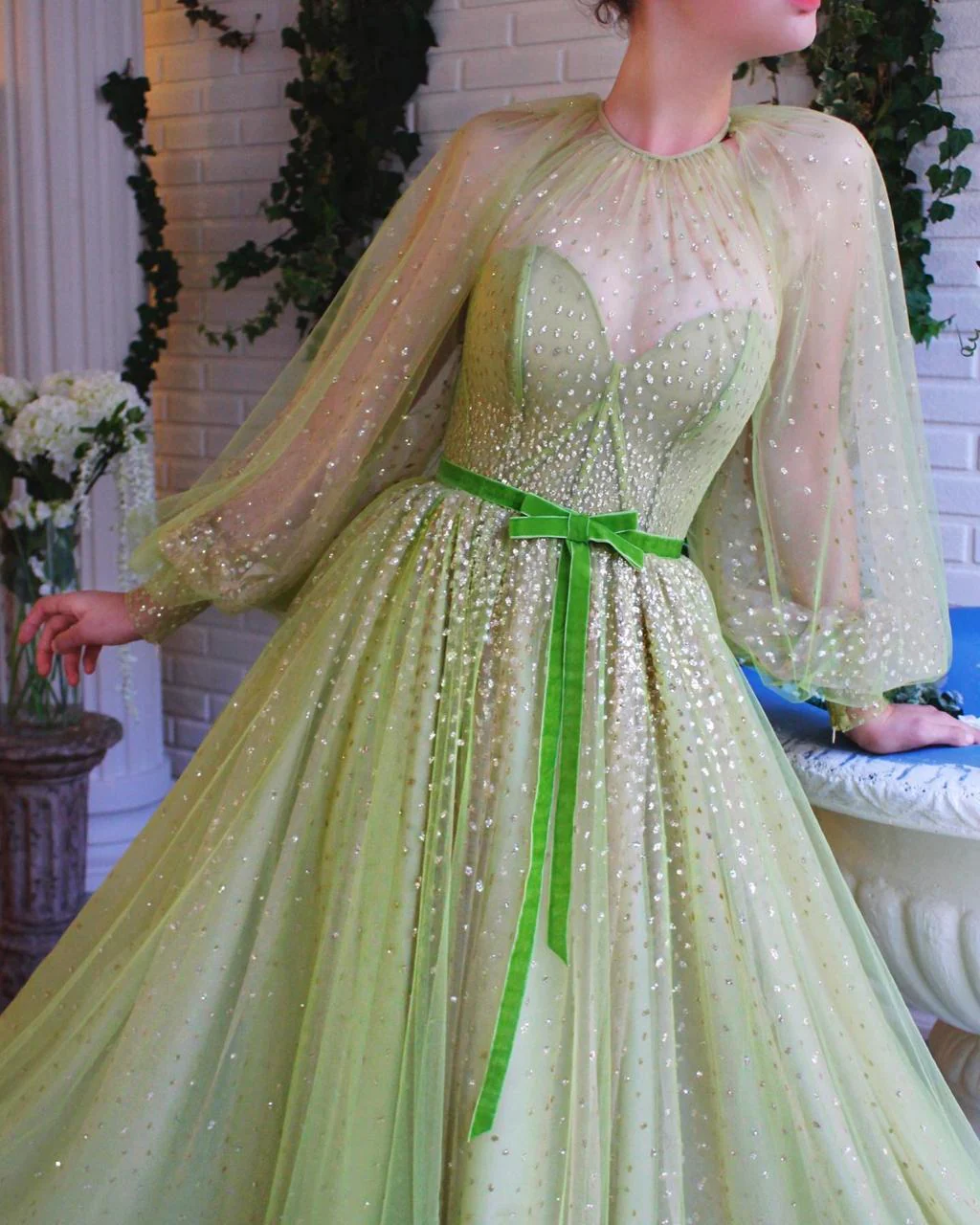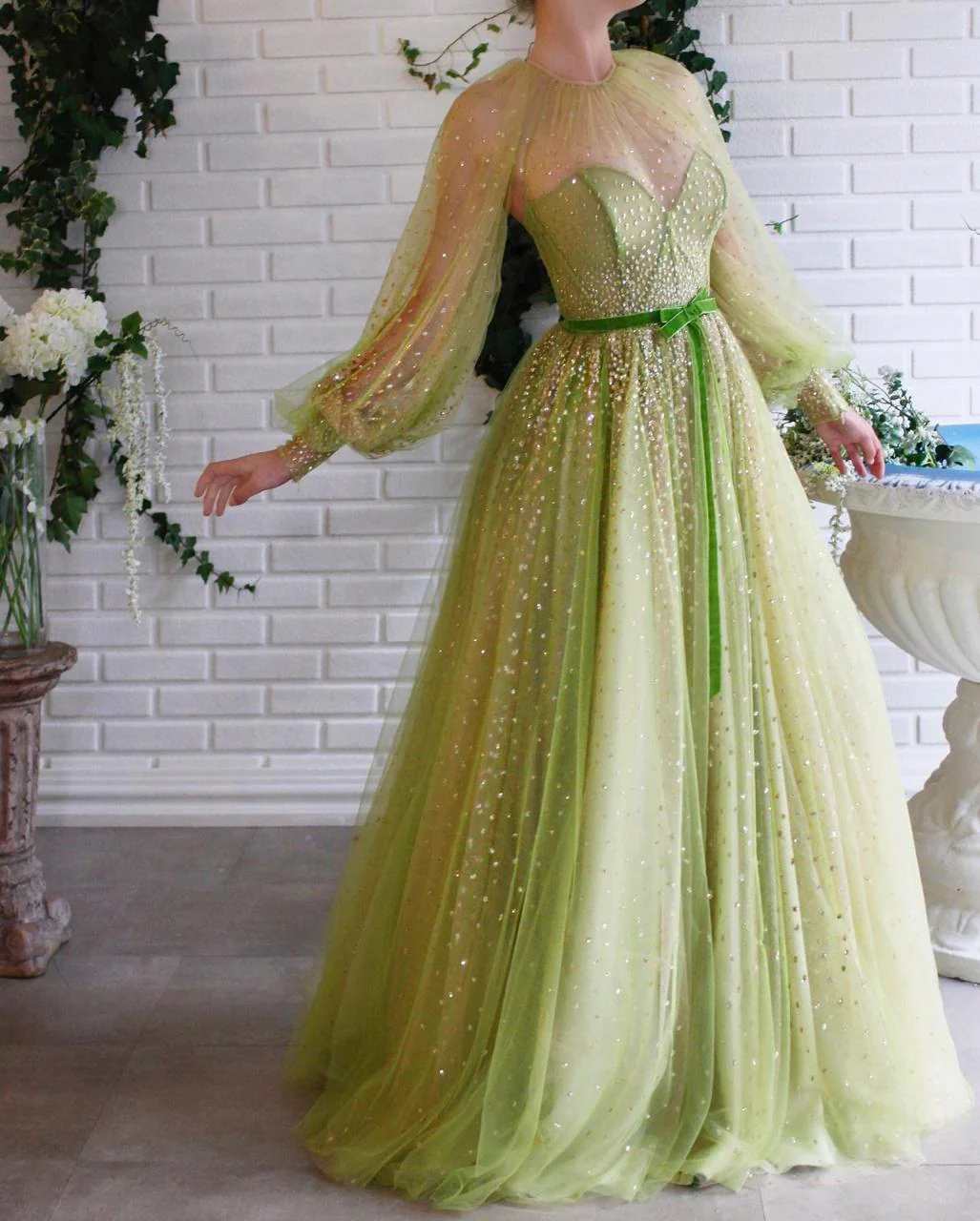 - A-line gown with waist definition and long sleeves
