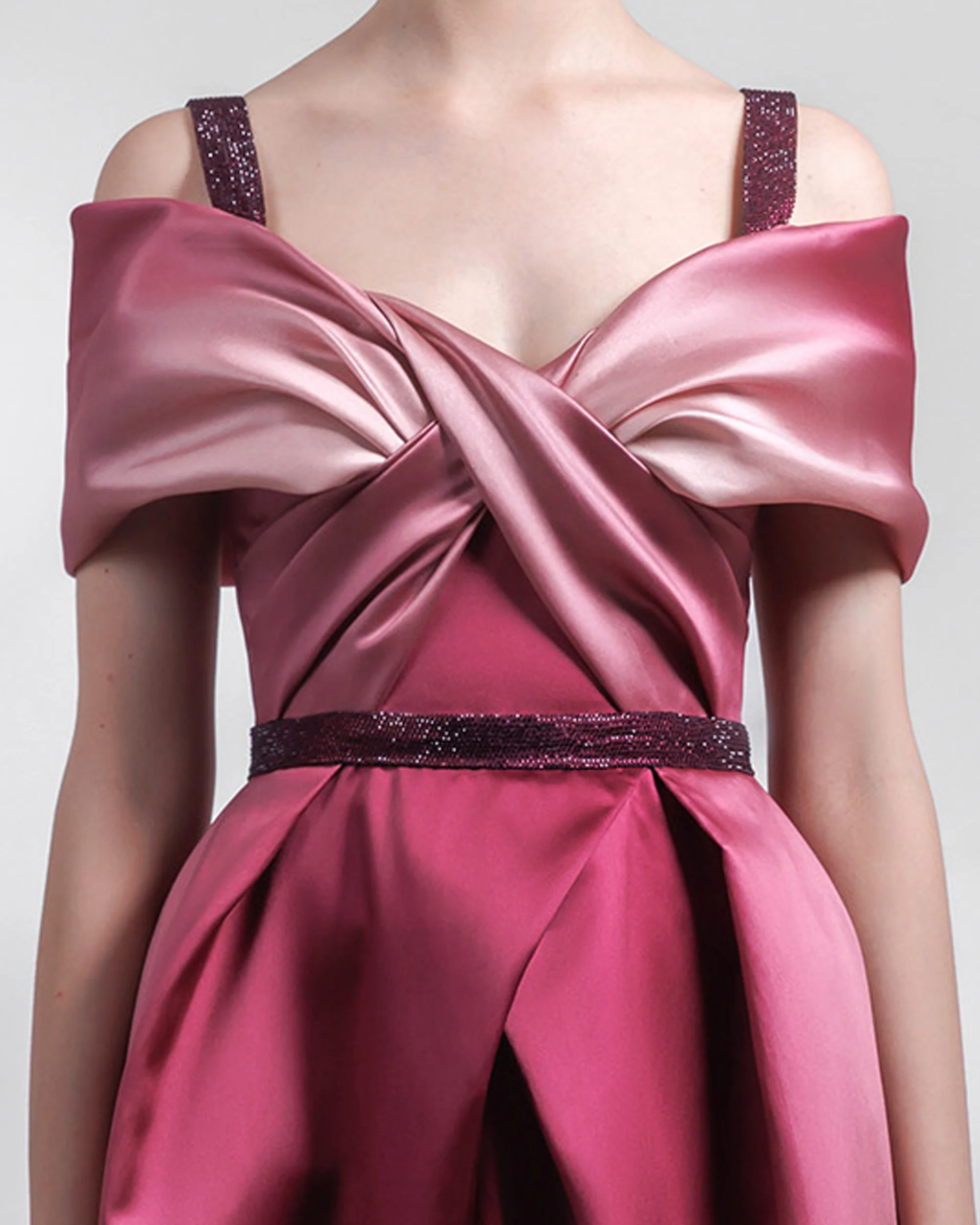 Description: Heavy satin midi dress with a bow-like bodice and draped design.