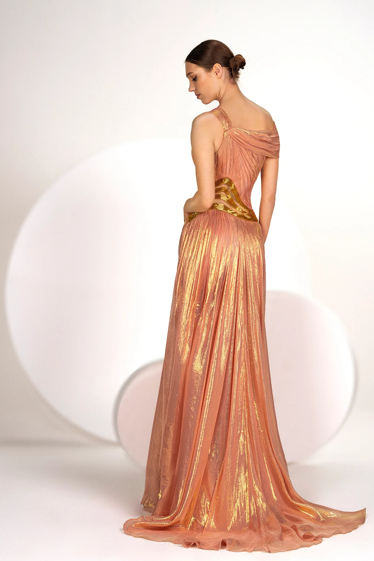 Pink gold lurex flared dress, asymmetric neckline, one off-the-shoulder, one sleeveless, pleated fitted bodice, gold sequins across waist and hips in wave-like lines, flared A-line skirt, side slit.