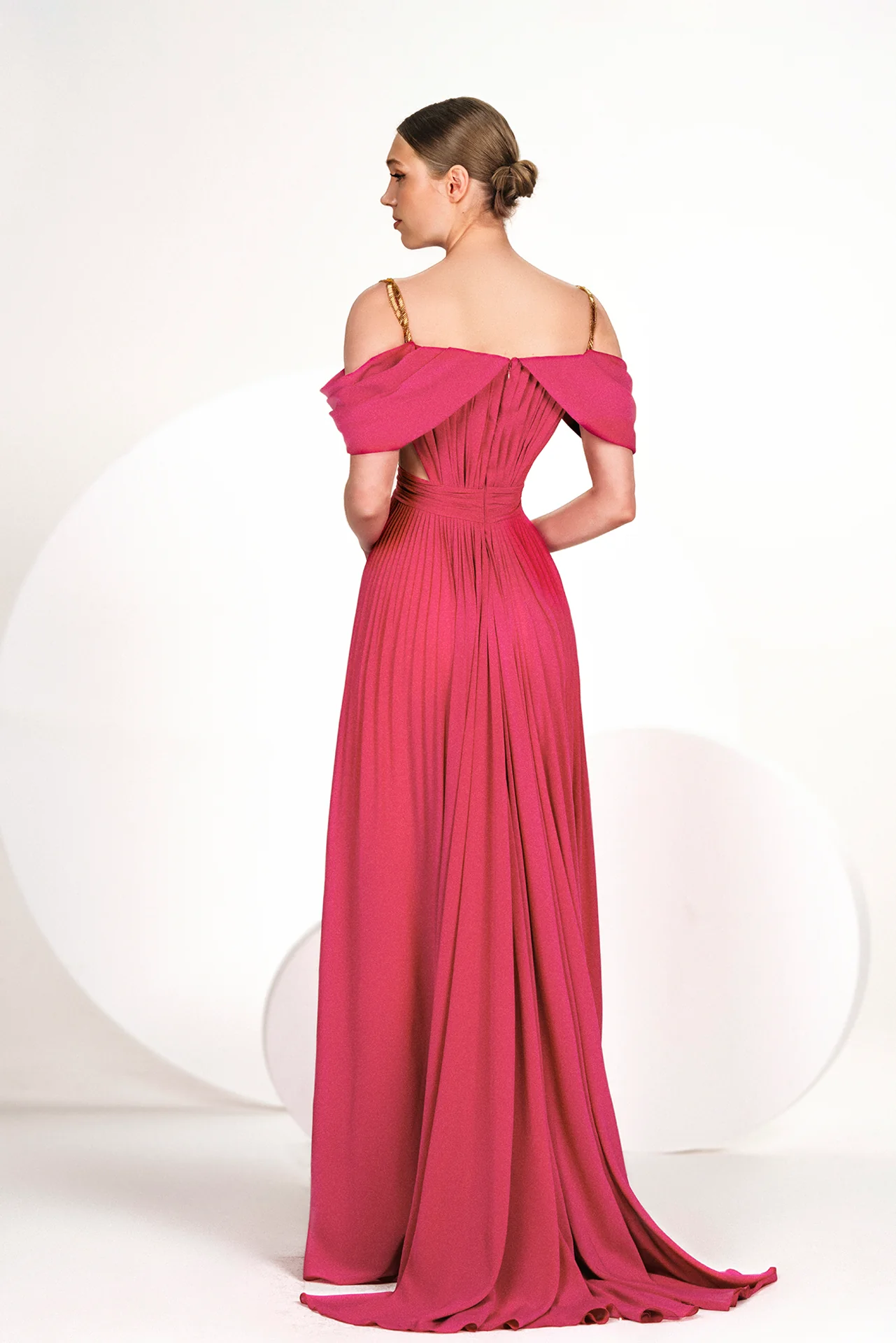 Indian red A-line dress, cold-shoulders with sequin spaghetti straps, draped short sleeves, fitted pleated bodice, side panel illusions, flared A-line skirt, front side slit.