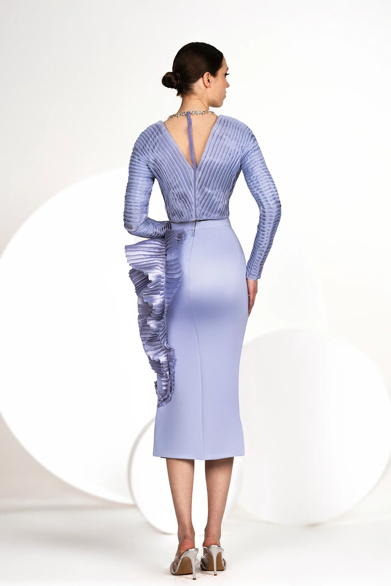 Lilac cadi long-sleeved pleated top, V neckline with straps and silver stones, cadi fitted midi skirt, side pleated ruffle running length of skirt.