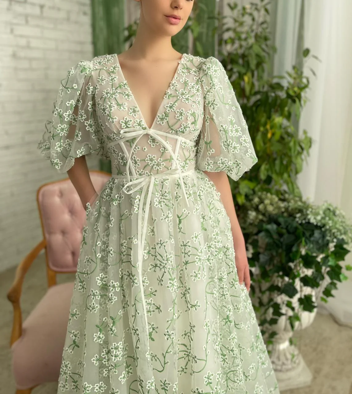 Mint Camelia Puff Sleeve Dress