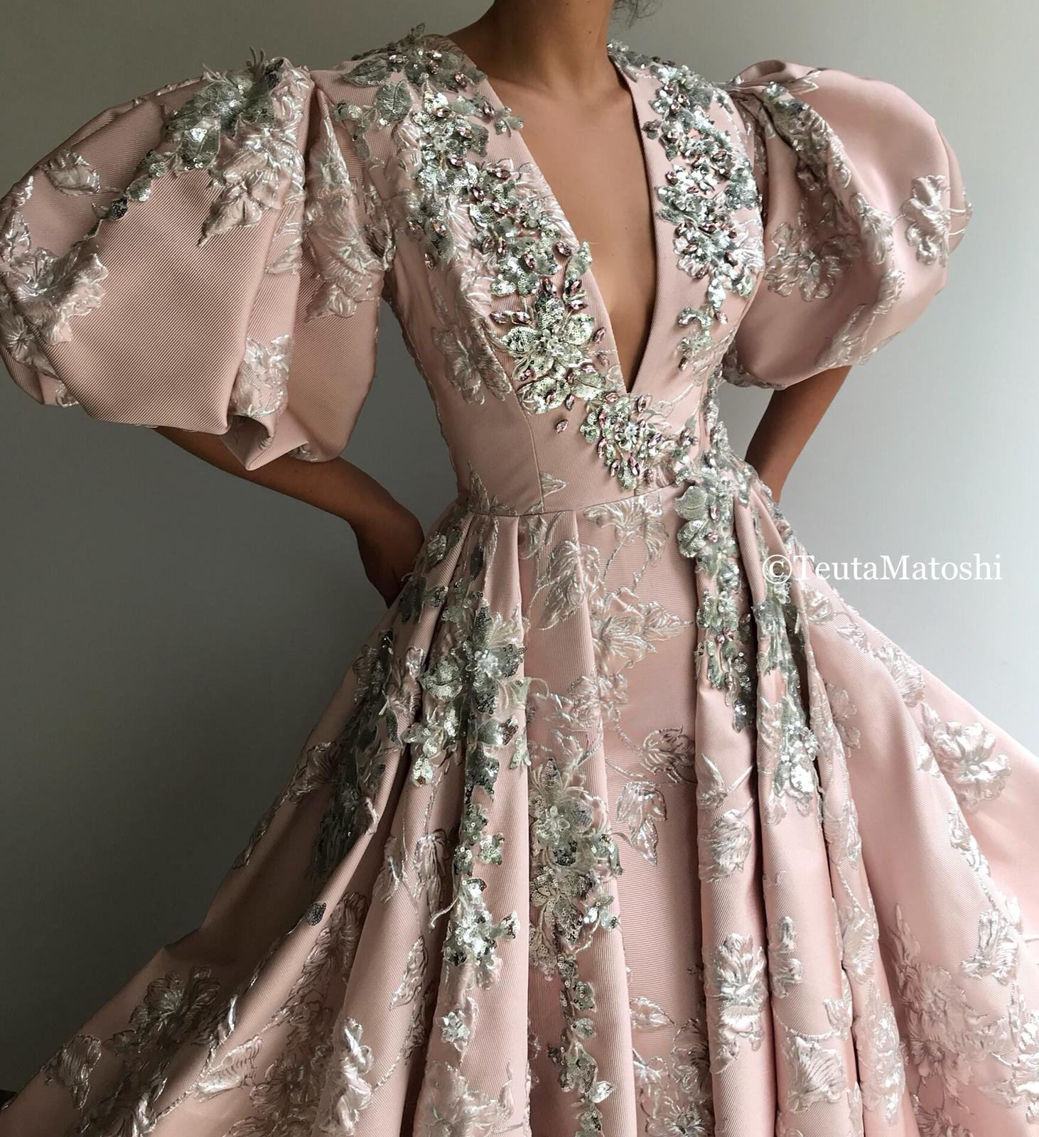 Silvery Blossom Puff Sleeve Gown
