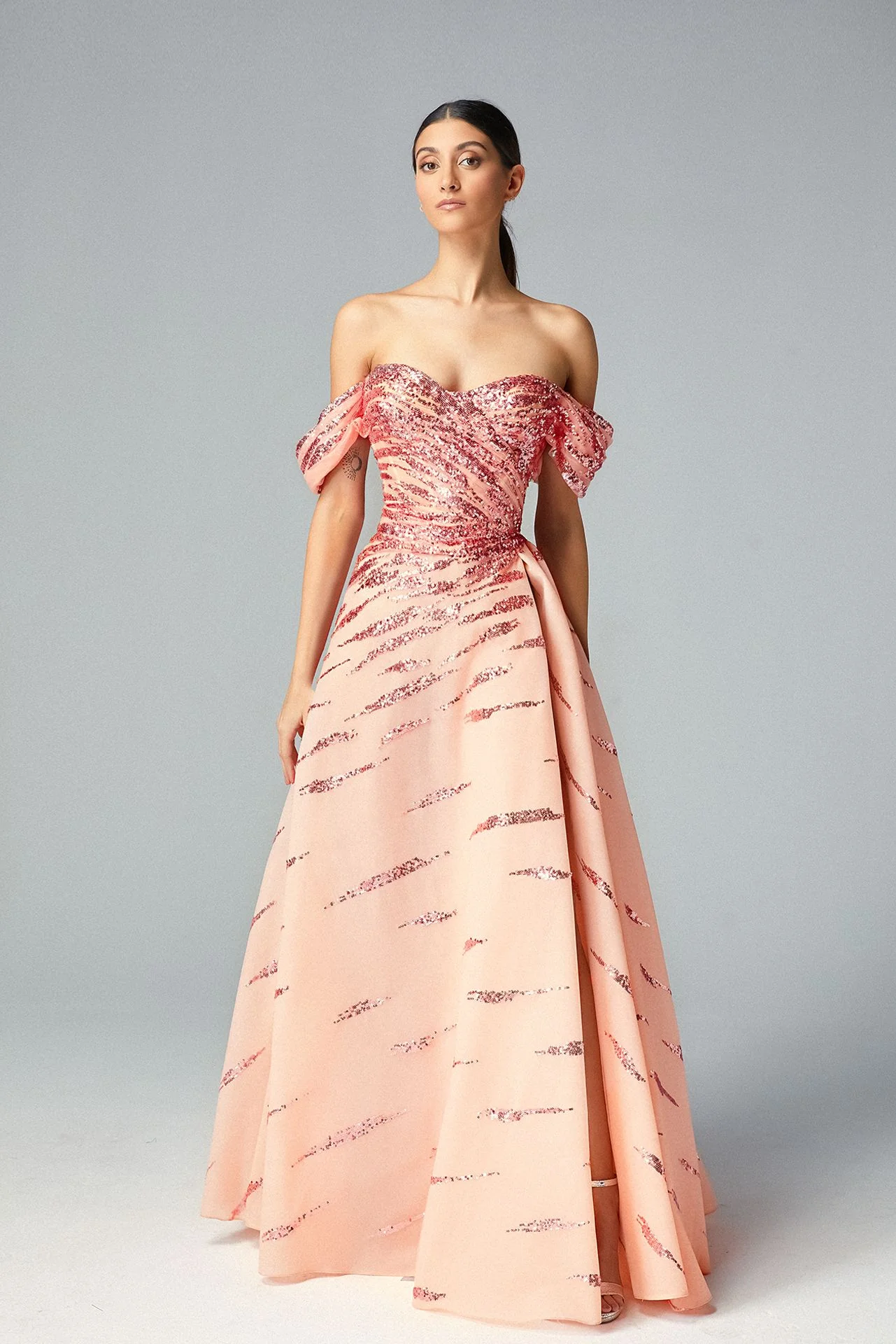 Off-shoulder Sweetheart Crepe Pink Ball Gown Tulle with Foliage Sequined Pattern
