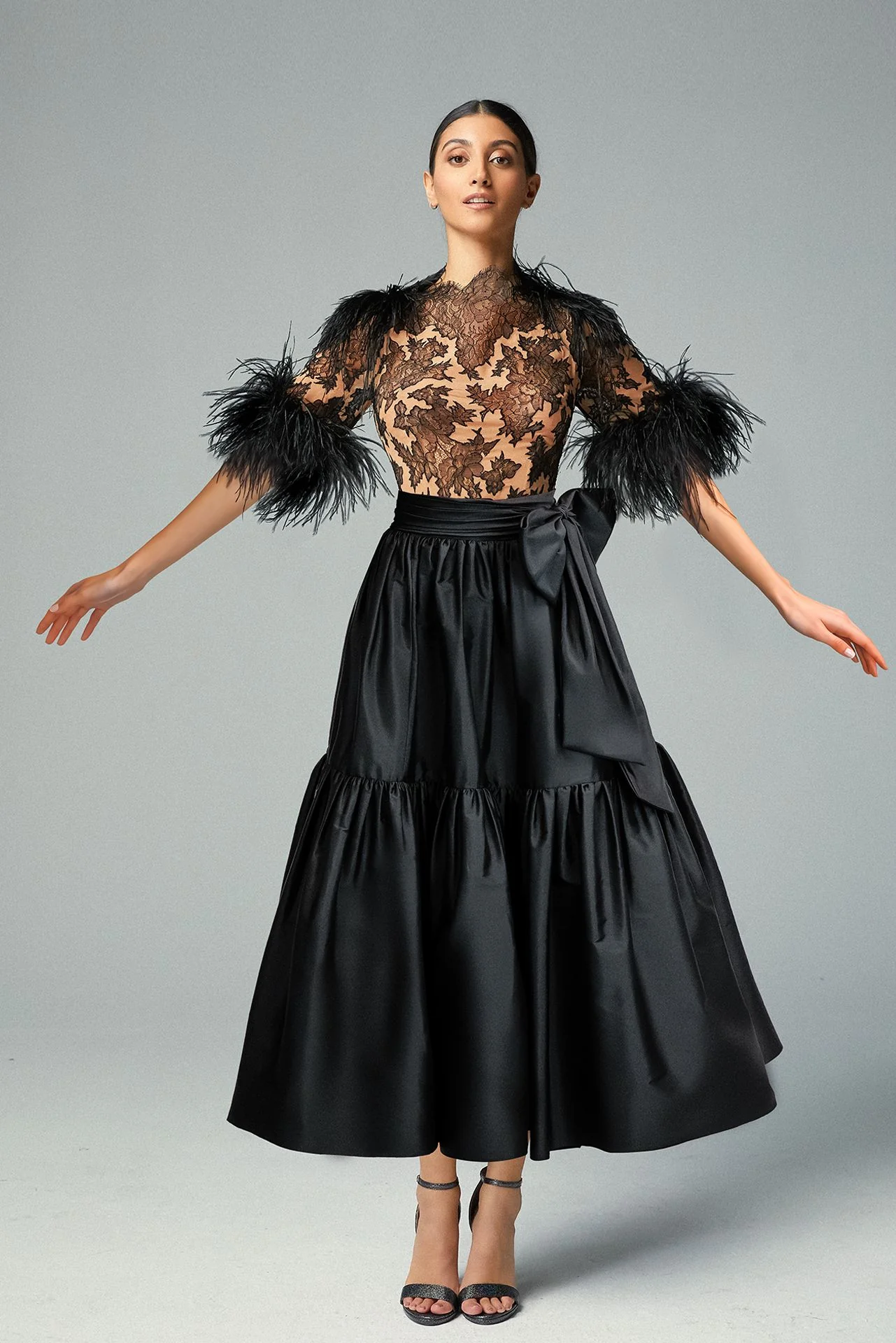 Feathered Dentelle Dévore & Crepe Georgette & Black Taffetas Long Skirt