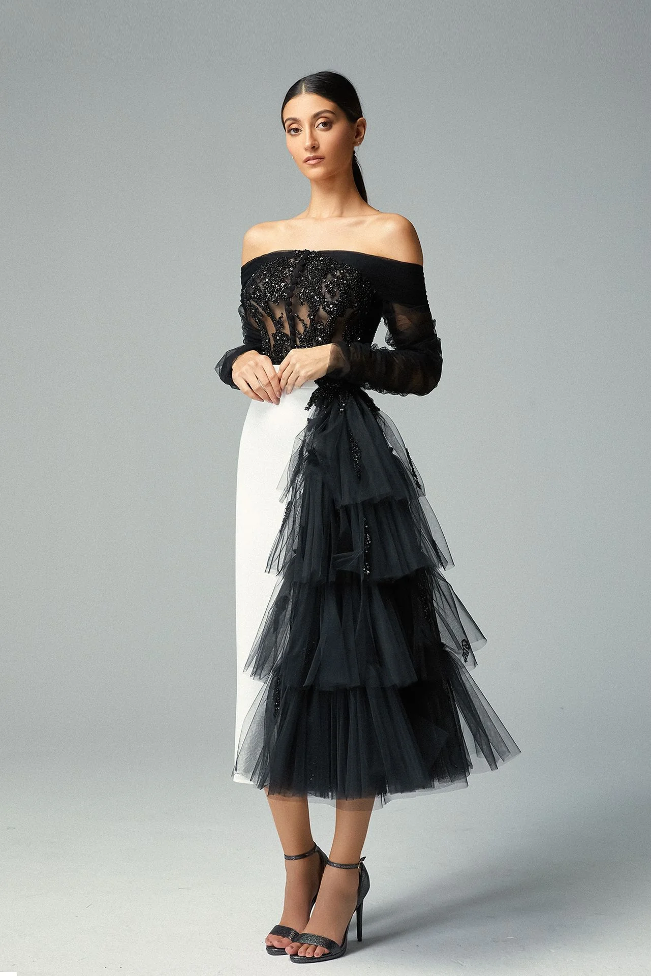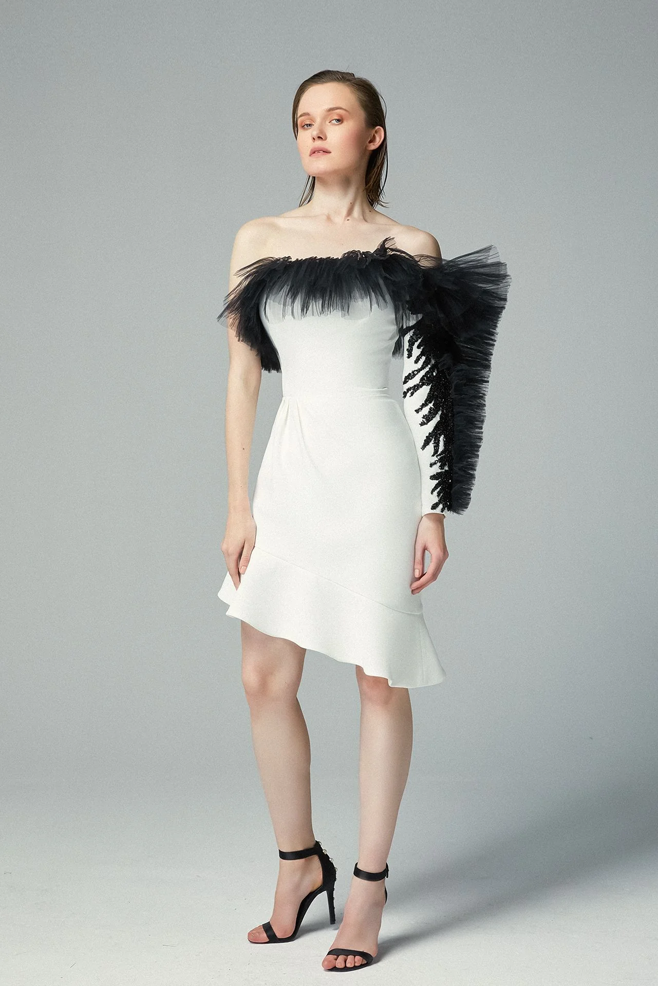 White Crepe Midi Dress Asymmetric Ruffled Black Neckline Tulle Sleeve Black Embroidery