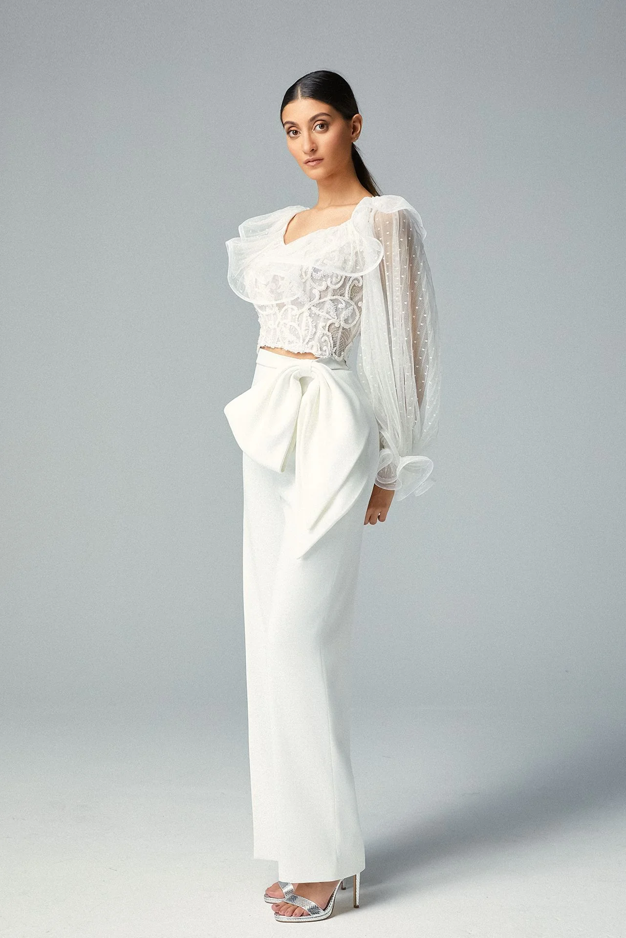 Embroidered White Corset Top Sequined Motifs, Bow Tie White Crepe Pants