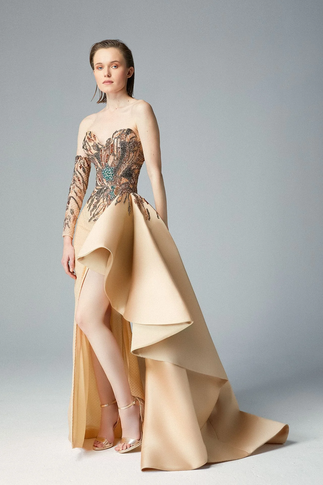 Champagne Cady Net Fabric Evening Dress, Crystals & Sequins Embroidery & Over-skirt
