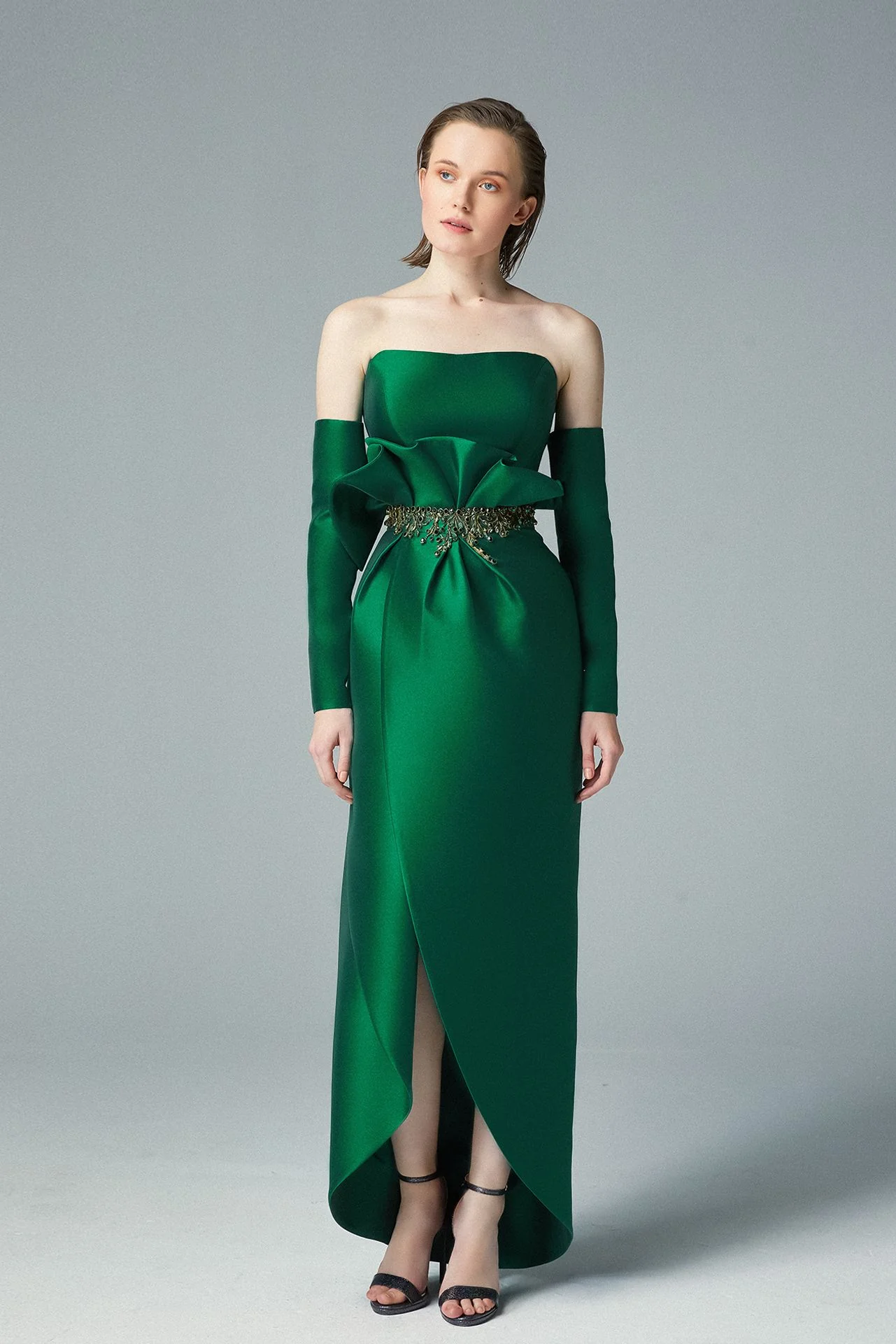 One Shoulder Cady Teal Green Column Dress Side-draped Handmade Stalk Gold Embroidery